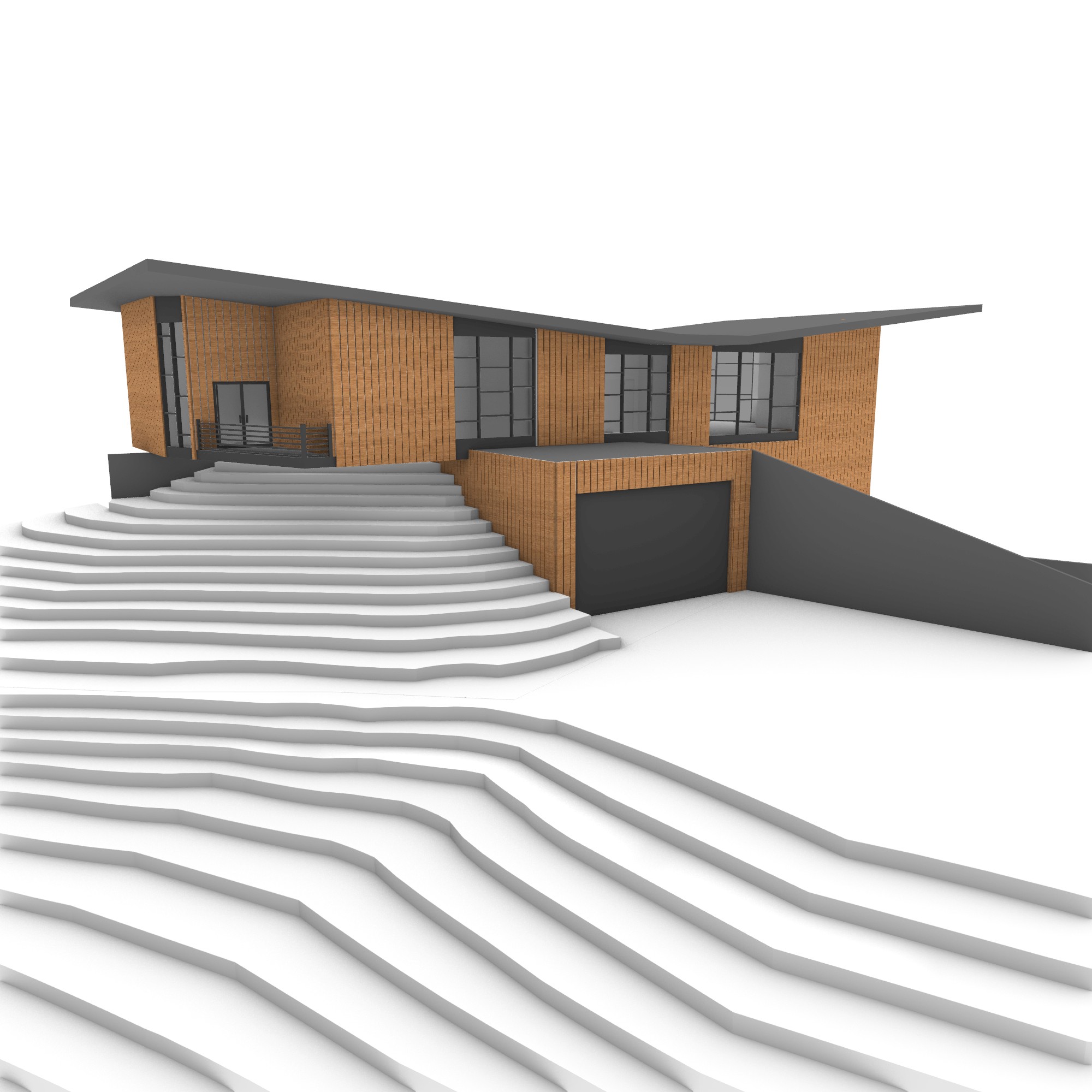soft textures the roof is a standing steam black the walls are medium wood paneling stone pavement with plants and trees in the planters hils on left