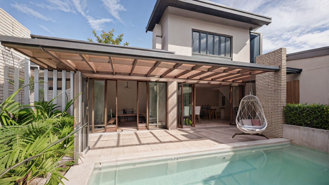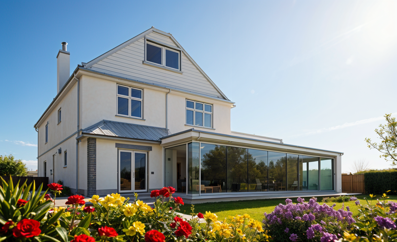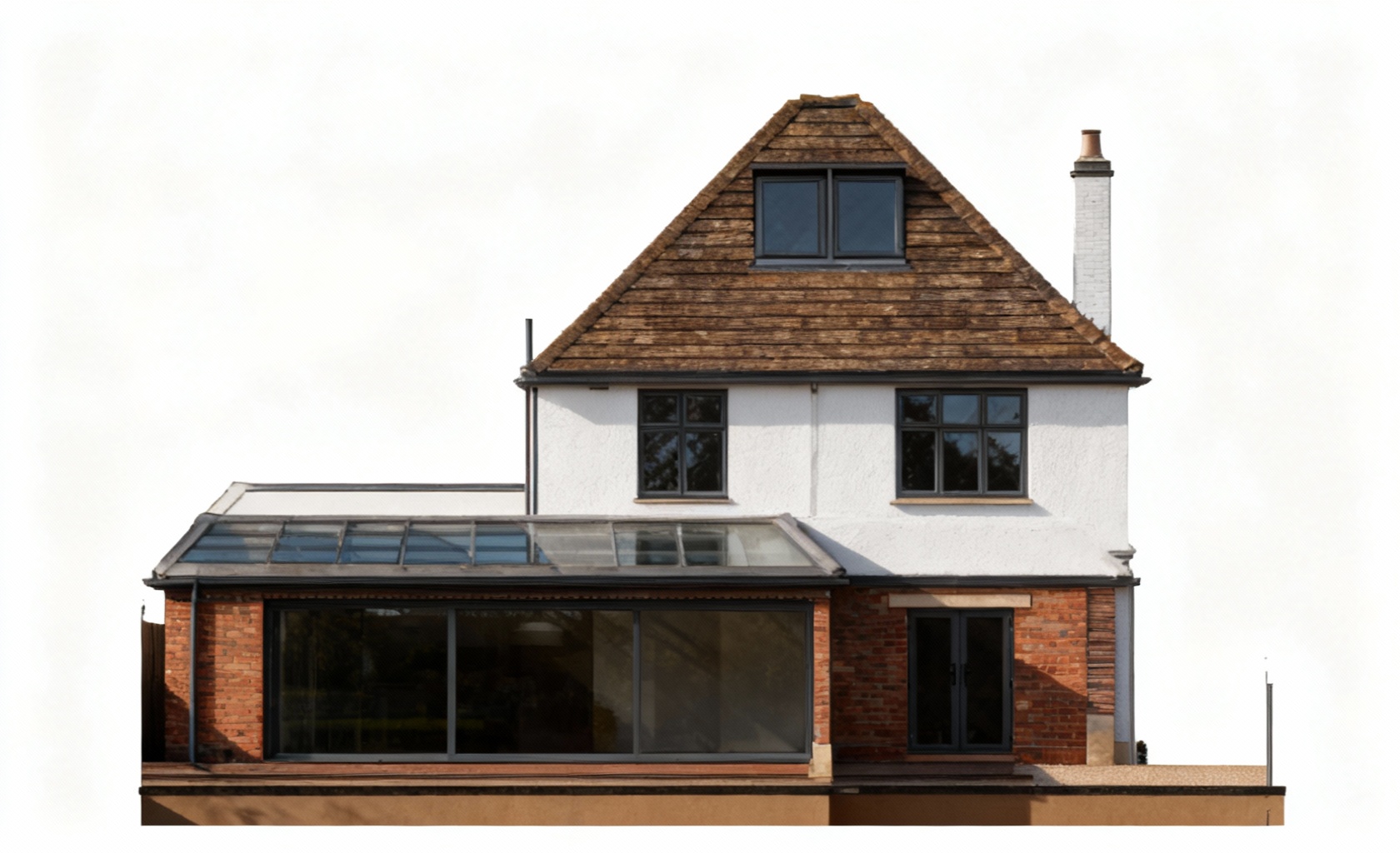 exterior shot black minimal frame sliding doors windows white render to first floor walls brickwork to groundfloor walls
