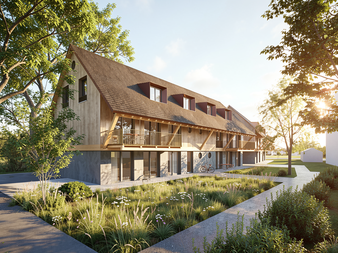photorealistic aerial render of nano banana wellness cabin resort northern ireland use this sketchup masterplan layout exactly replicate the precise positioning of every cabin the circular spa drum building the free form lake with curved stone edging the circular hot tub island mound and all winding pathways replace every green yellow blue and orange marker pole with a full mature native tree oak birch rowan hawthorn and scots pine at appropriate scale with full canopy the hillside behind the resort planted densely with native woodland cabins are dark stained timber with flat or shallow pitched roofs each set within its own circular grass clearing separated by soft mounded berms and wild planting winding organic paths in pale gravel connect all areas lake water calm and reflective cinematic late afternoon light clear blue northern irish sky with scattered high white clouds low golden sun casting warm long shadows deep emerald green grass rich autumn edge colours warm timber tones pale stone paths blue grey water patchwork northern ireland farmland and gentle hills visible beyond resort boundary shot from elevated drone angle matching the sketchup viewpoint exactly hyper photorealistic magazine editorial quality hasselblad h6d 50mm f 4 golden afternoon light 8k resolution unreal engine 5 lumen global illumination ar 16 9 style raw stylize 800 v 6 1 quality 2 negative prompt marker poles coloured posts construction markers sketchup style cartoon cgi plastic flat lighting overcast foggy tropical trees palm trees blurry watermark fake hdr distorted buildings generic hotel