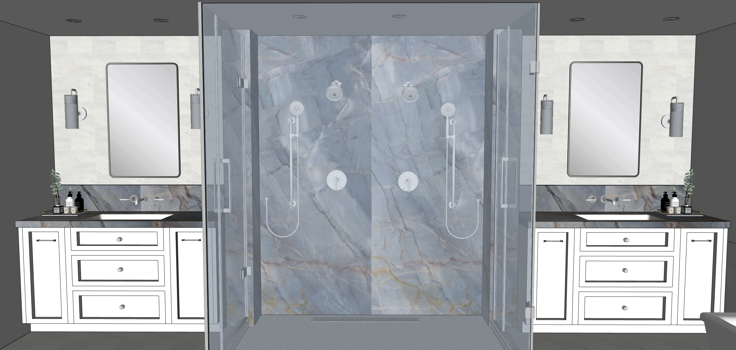 interior bathroom day time natural lighting soft shadows space is evenly lit recessed ceiling lights on white light 5000k lighting temperature interior photography realistic slightly reflective
