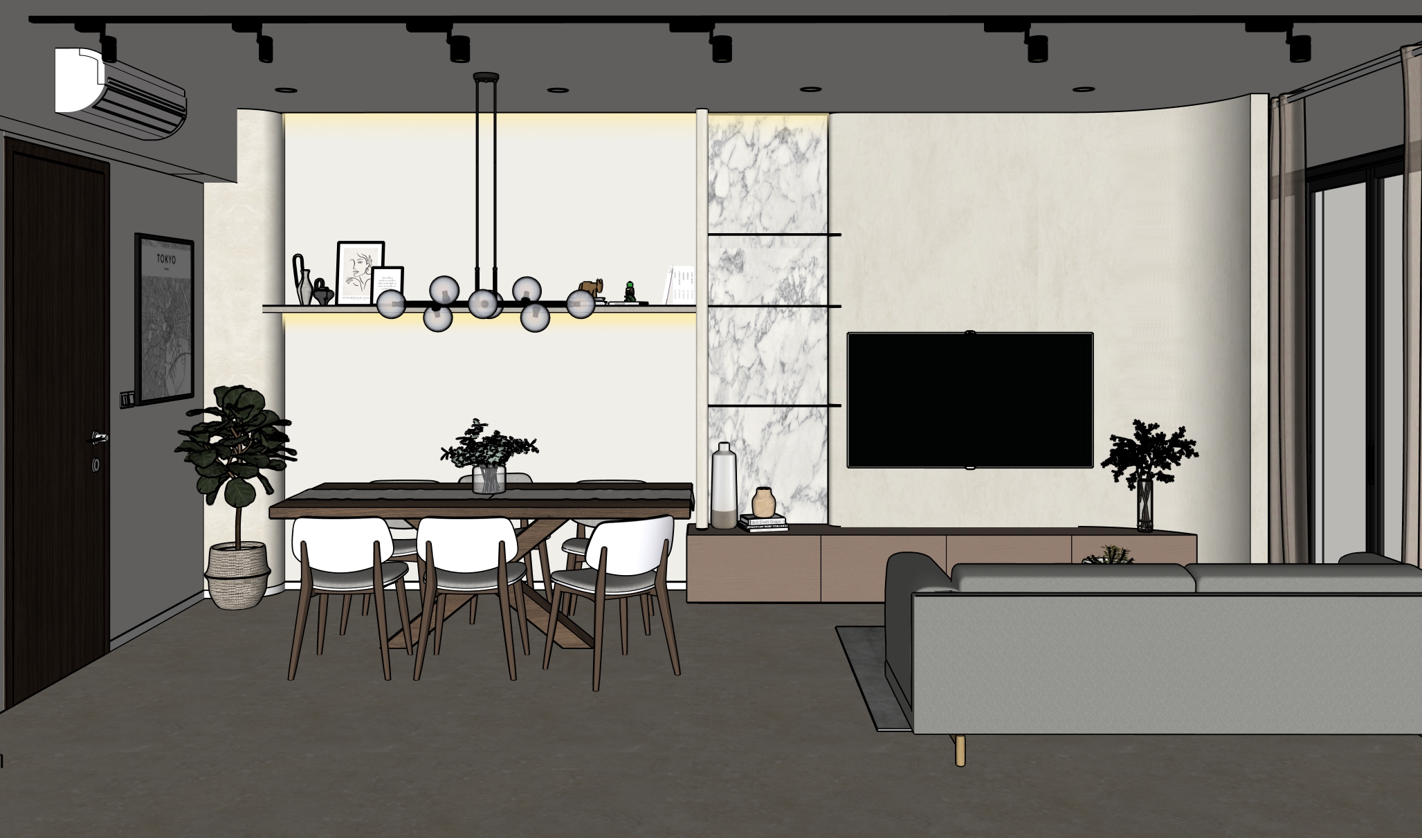 colour and wood texture less grains to remain as per original pictures floor in light beige tiles grout to match tv console wall in light beige microcement tv console and cabinet in muted dark ash blush as per original picture curve wall sitting ontop of tv console
