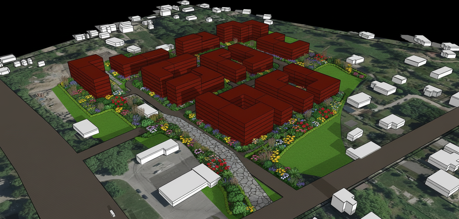 sarineen exterior shot render the provided reference image exactly as is do not change geometry proportions building sizes heights 4 6 floors spacing layout or camera angle mid rise residential buildings with well articulated facades brick light plaster and concrete surfaces deep window reveals clear horizontal floor expression recessed balconies occasional bay windows architecture feels contemporary yet restrained nordic baltic in character durable human scaled and calm ground floors clearly defined with entrances glazing and subtle architectural detail people friendly urban environment landscaped courtyards trees pedestrian paths benches bicycles families and residents using the space naturally soft natural daylight warm but realistic tones photorealistic architectural visualization professional believable no stylization architecture