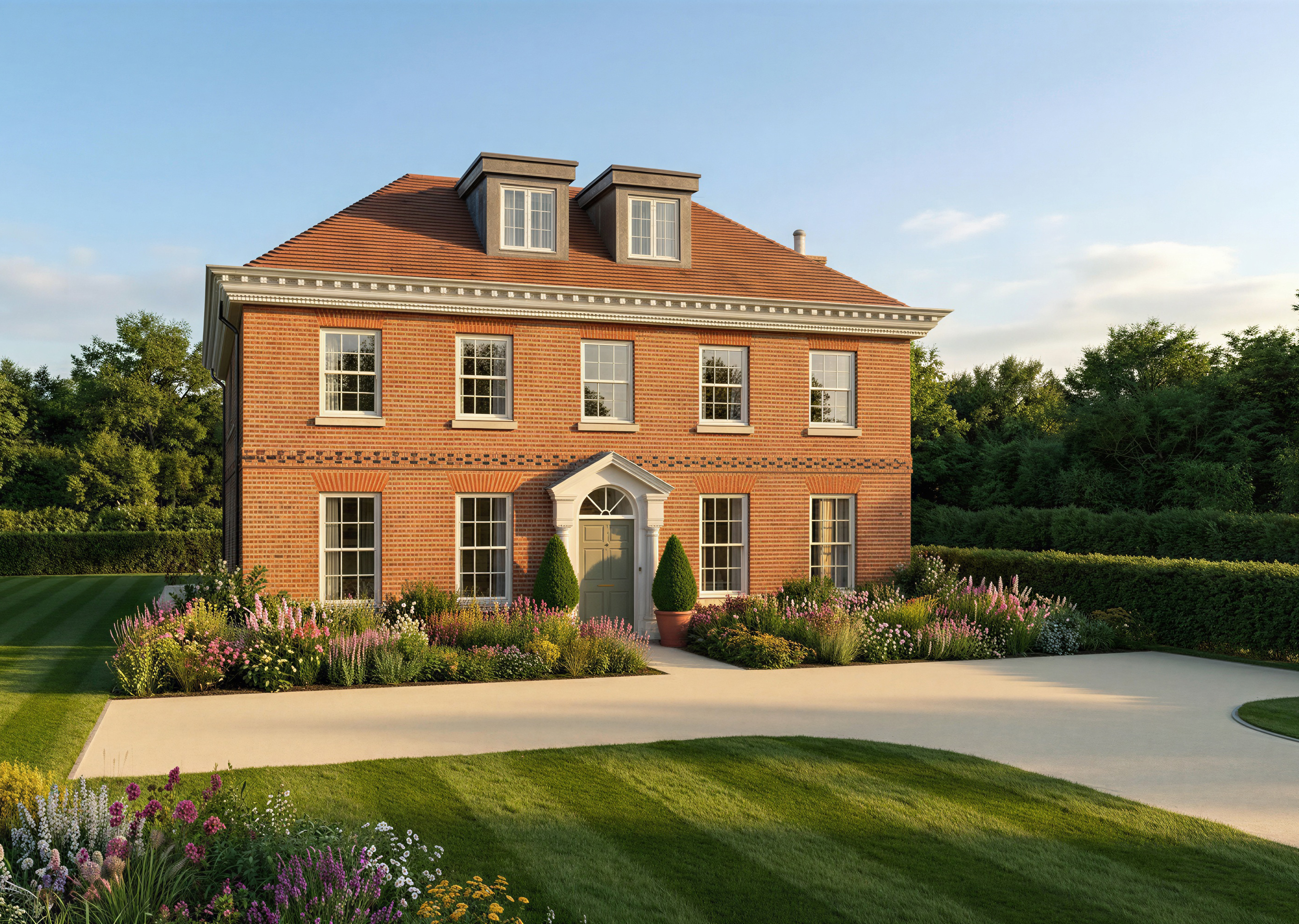 suggest a rolling hills in the far distance and trees view on the left hand side behind the house
