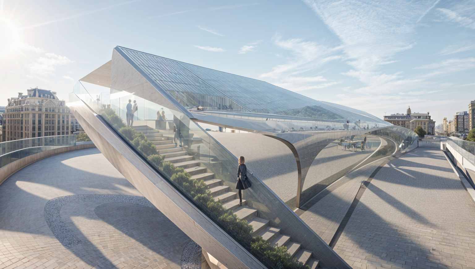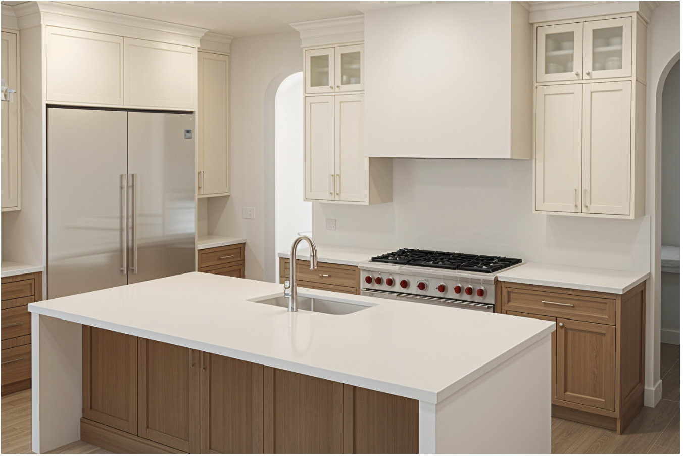 interior shot elegant contemporary kitchen with large stainless french door refrigerator arched hallway quartz hood and back splash quartz waterfall island warm white top cabinets and oak bottom cabinets