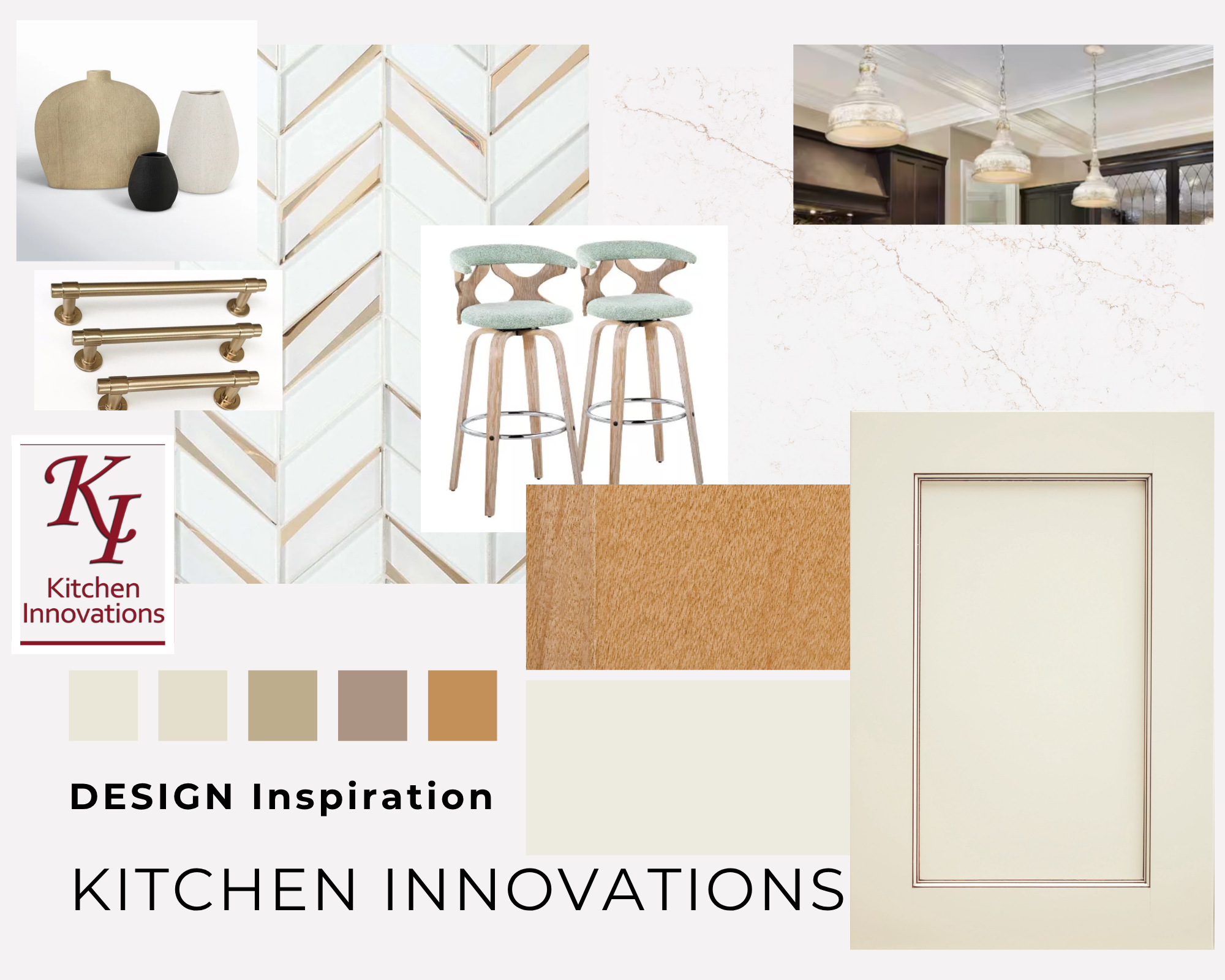 exterior shot create a modern kitchen interior design with a sophisticated and elegant vibe include a chevron patterned tile in white and gold set against a warm neutral color palette feature sleek brass drawer handles for a touch of luxury add light mint green bar stools with natural wooden legs for a fresh accent incorporate warm oak wood textures and use a creamy off white for cabinetry the atmosphere should be serene and harmonious with soft diffused lighting enhancing the space