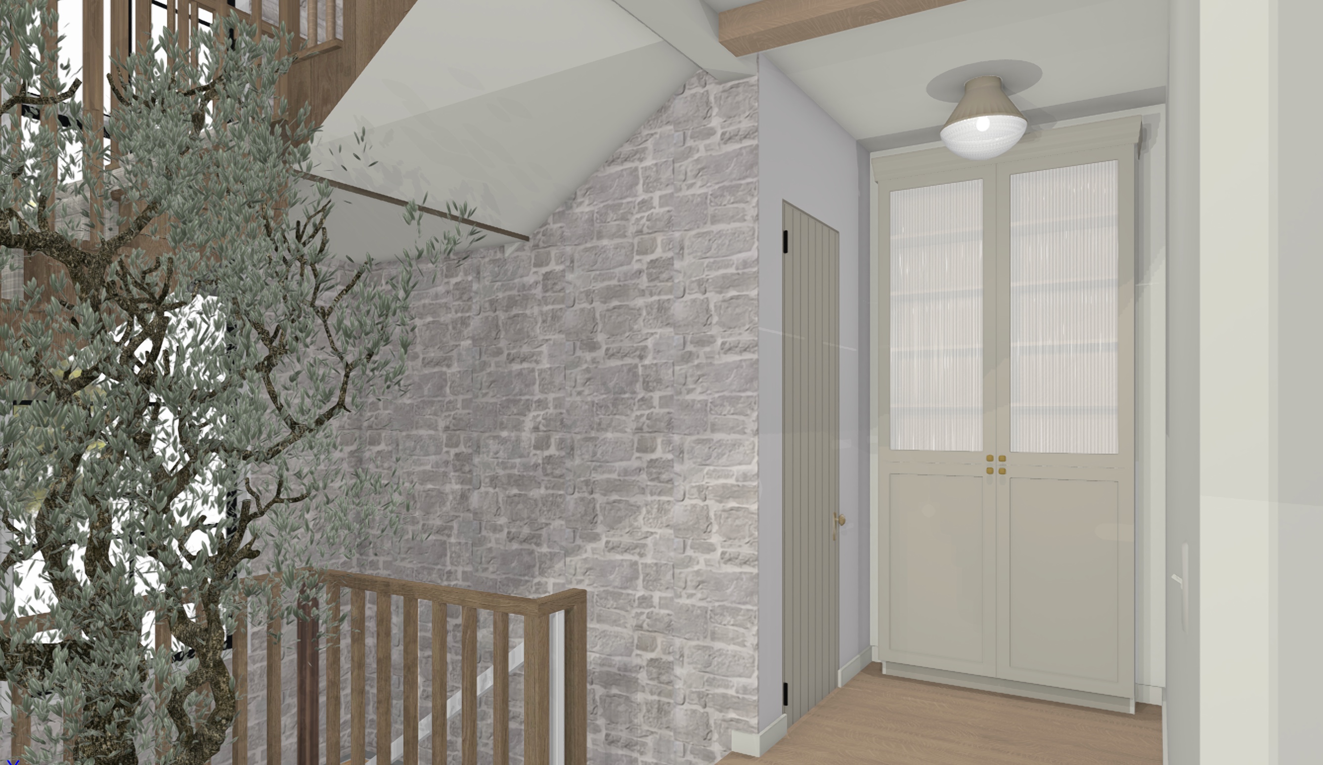 keep everything the same don t change anything the colors textures or contrast also do not add anything just make this rendering look like a real hallway in soft neutral natural light