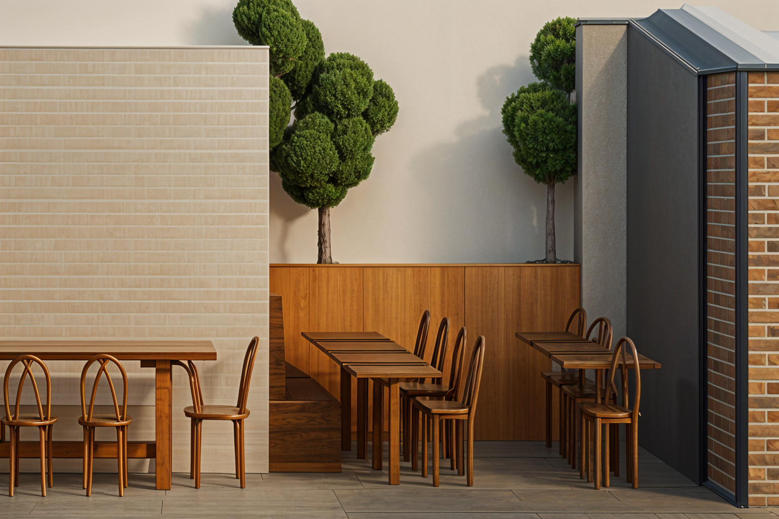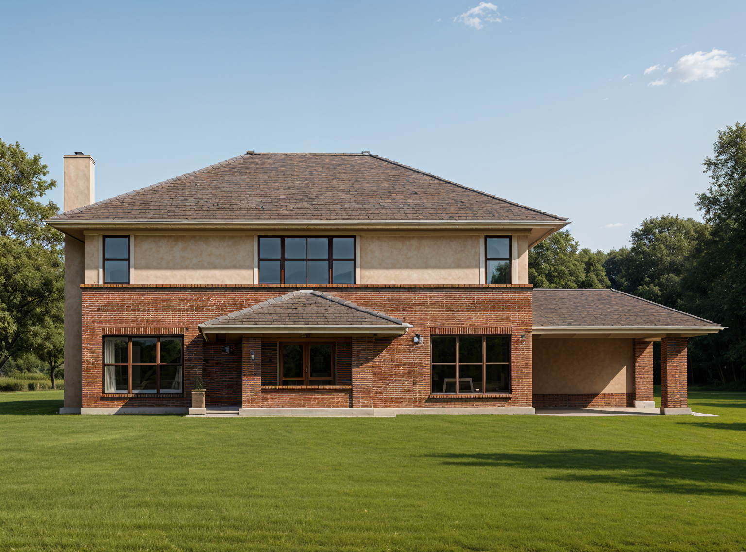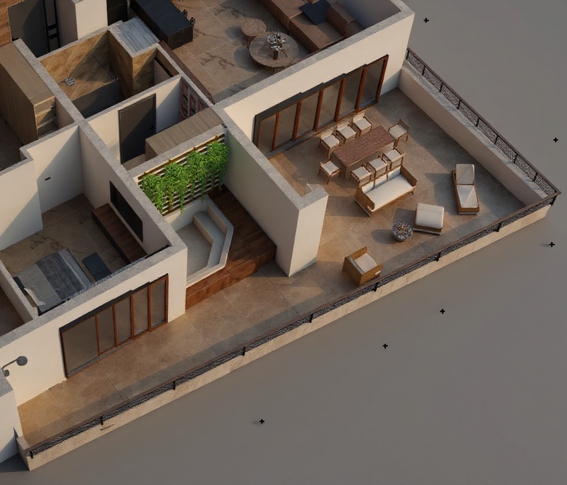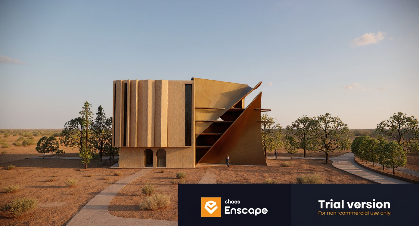 dont change my building hyperrealistic architectural render of my existing building design keeping all geometry exactly the same replace current materials with warm natural rammed earth walls and bronze aluminium composite panels use soft desert sunlight with slight shadow gradients surround the building with minimal landscaping including native desert shrubs acacia trees and paved pedestrian paths add a few people casually walking or standing for scale