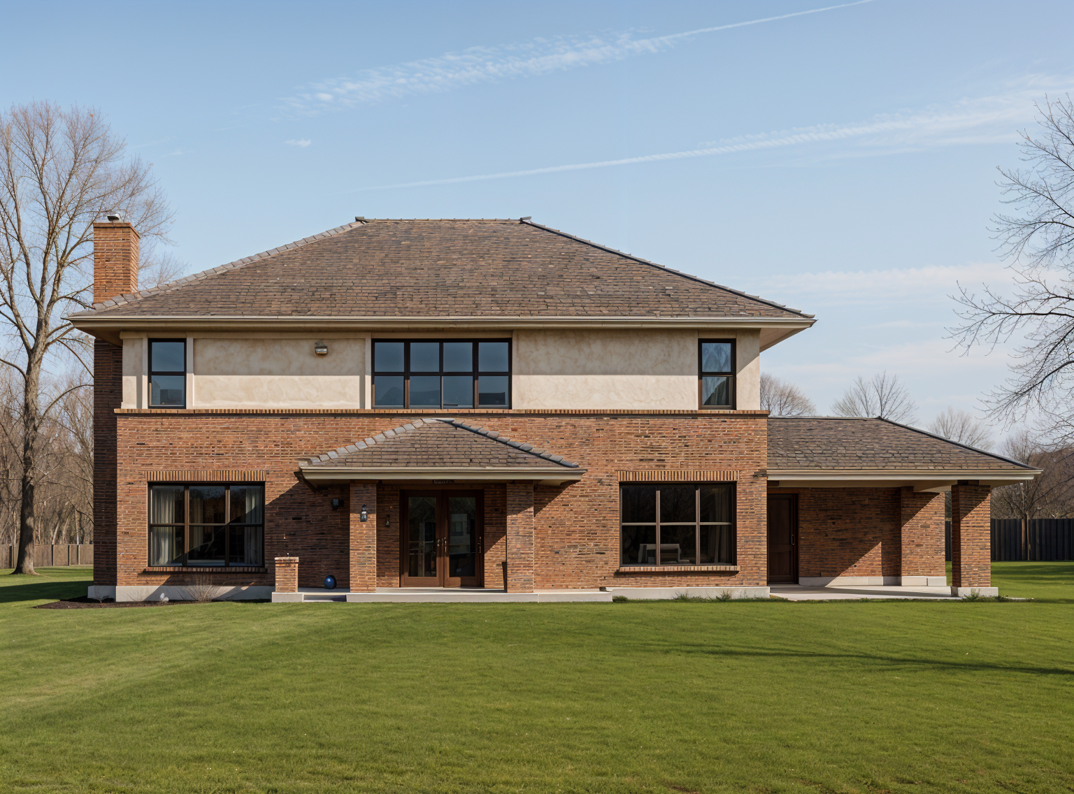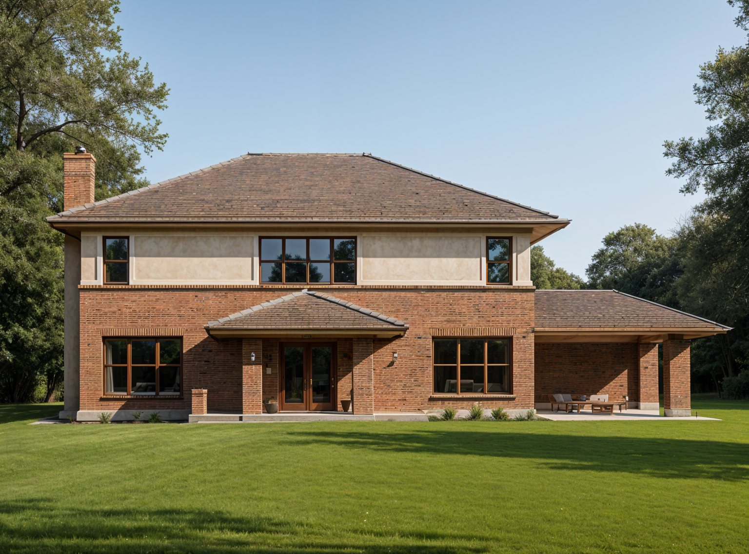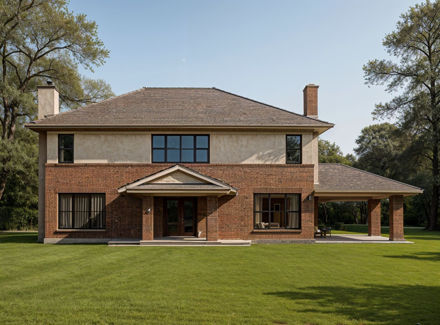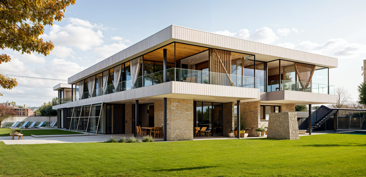 dont change my building hyperrealistic architectural render of my existing building design keeping all geometry exactly the same replace current materials with warm natural rammed earth walls and bronze aluminium composite panels use soft desert sunlight with slight shadow gradients surround the building with minimal landscaping including native desert shrubs acacia trees and paved pedestrian paths add a few people casually walking or standing for scale