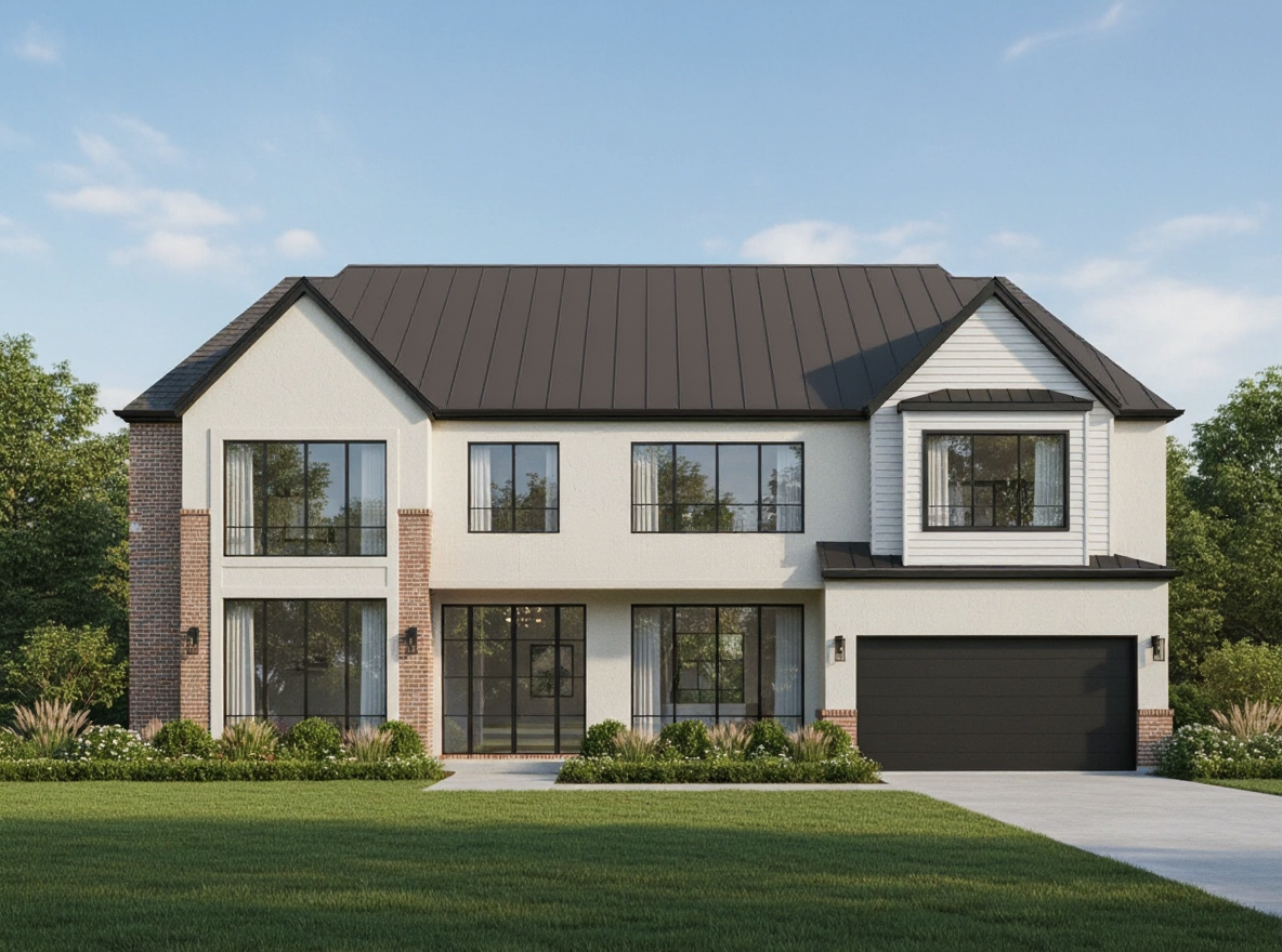 ultra photorealistic cinematic rendering of a transitional two story home with light cream stucco walls black steel windows midday natural sunlight from the front with soft directional shadows and realistic reflections on glass set in an elegant luxury suburban neighborhood with manicured landscaping lush green lawn trimmed hedges and a straight concrete walkway leading to the front door high end architectural photography aesthetic shallow depth of field subtle lens bloom physically based pbr materials realistic stucco texture detailed roof shingles 8k ultra quality shot on leica full frame camera with 35mm lens editorial lighting balance color graded for warmth and depth