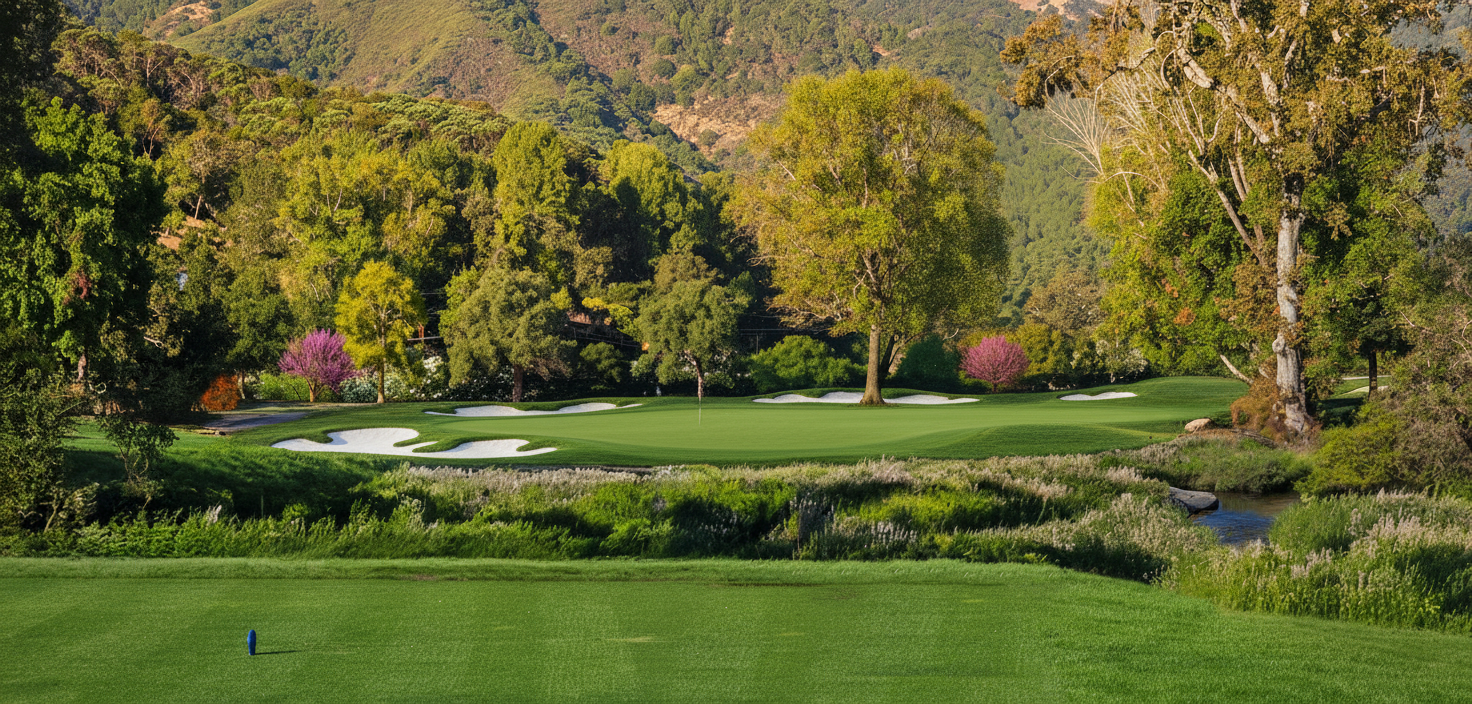 create a hyper realistic high resolution photographic after view of hole 17 at marin country club novato ca using the attached base photo and sketch overlay task convert the sketch overlay into real buildable photoreal golf course materials and blend them into the photo so the result looks like one coherent real photograph this is a materials texture lighting pass only absolute camera composition lock highest priority preserve the exact base photo perspective lens feel horizon framing and angle no zooming cropping shifting tilting or re centering background trees hillsides sky creek and vegetation remain exactly as photographed immutable sketch geometry lock highest priority treat the sketch overlay as a hard construction mask every sketched element must remain exactly as drawn tee fairway rough approach green collar bunkers and landform edges do not add or remove any golf features do not add bunkers or alter bunker count do not delete break or narrow the fairway only replace sketch colors with photoreal materials inside the sketched footprints photoreal material conversion materials only convert each sketched color zone into realistic turf sand while keeping boundaries fixed fairway lighter yellow green central zone short tight cool season fairway cut photoreal leaf texture with subtle mowing stripes aligned with play direction natural sheen and slight tonal variation no flat gradients maintained rough dark green zones 3 4 inch maintained rough darker tone coarser texture natural tufting soft feathering at fairway edges without crossing the sketch line putting green collar right side paler desaturated green with red flag ultra smooth photoreal green surface finest cut slightly lighter cleaner than fairway micro contours and realistic specular highlights collar approach transitions strictly follow sketch bunker photorealism only within sketched bunkers render bunkers as excavated punched into the landform hazards crisp confident edges exactly per sketch strong grass faces and clear lip definition clean bright sand with real grain and faint raking texture realistic depth and late afternoon shadowing matching base photo sun direction no additional bunkers anywhere landform shadow continuity landform shading must read continuous across existing terrain and new golf surfaces match ambient bounce shadow softness and sun direction of the base photo seamless integration blend remove all sketch colored overlay appearance no visible outlines halos cutouts or cartoon edges boundaries remain accurate but transition naturally into surrounding photo presentation grade finishing allowed global enhancement only enhance brightness contrast hue saturation color balance lighting and exposure uniformly for a polished after photo maintain late afternoon ambience consistent with the base image warm highlights soft shadows do not stylize or hdr overcook strict prohibitions must never occur adding any new features especially bunkers removing or shrinking any sketched element changing sketch geometry or edges changing perspective composition stylized rendering illustration concept art flat color fills cgi look output a convincing completed project real photo style after view that exactly matches the sketch geometry and reads as a single hyper realistic photograph