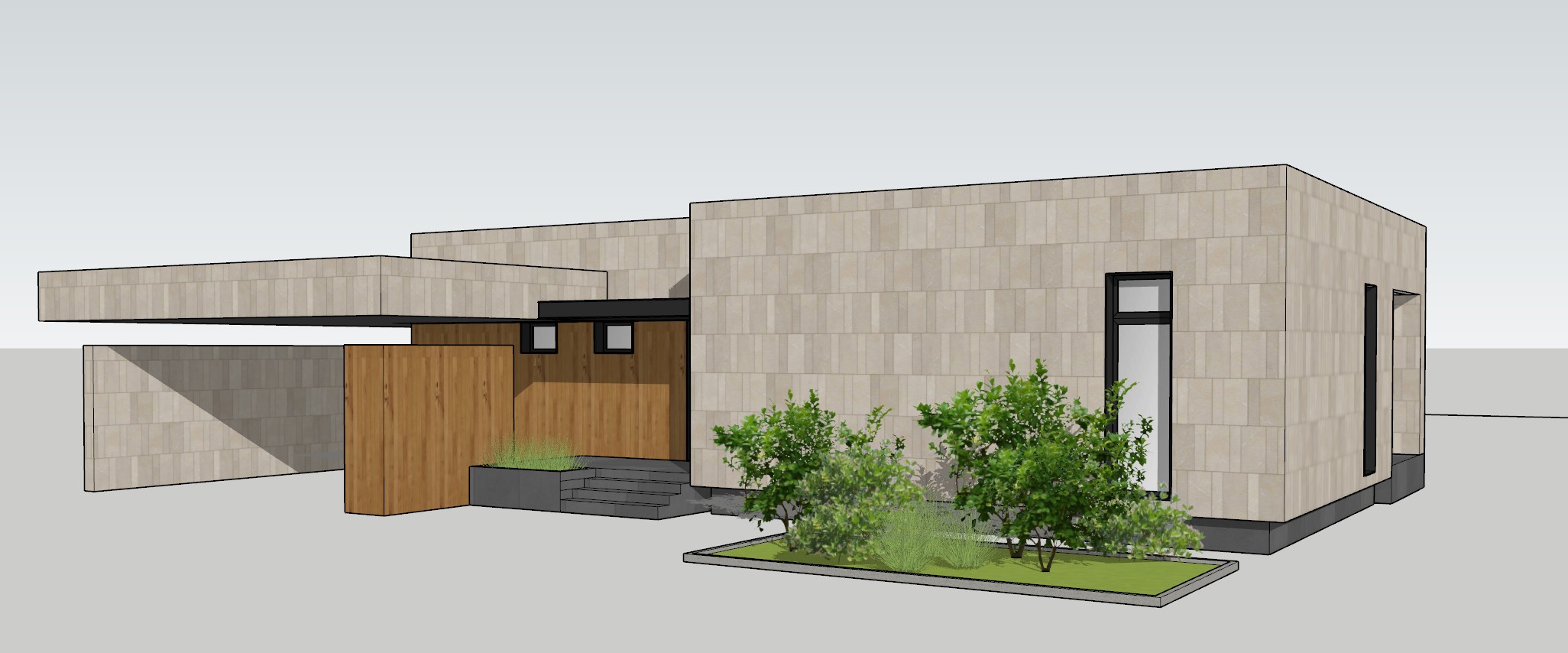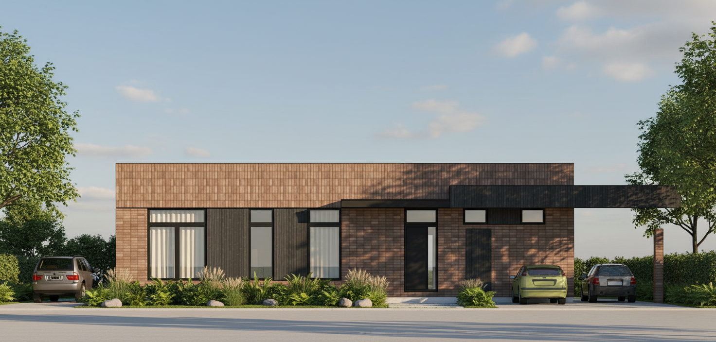 modern house clean minimalist lines natural facade materials wood stone glass japandi style subtle warm lighting realistic vegetation professional architectural visualization