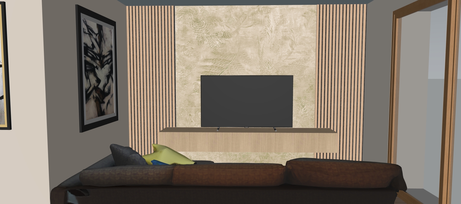 sofa is grey there is led light coming from the wood panels behind tv add more space between sofa and wall on the left
