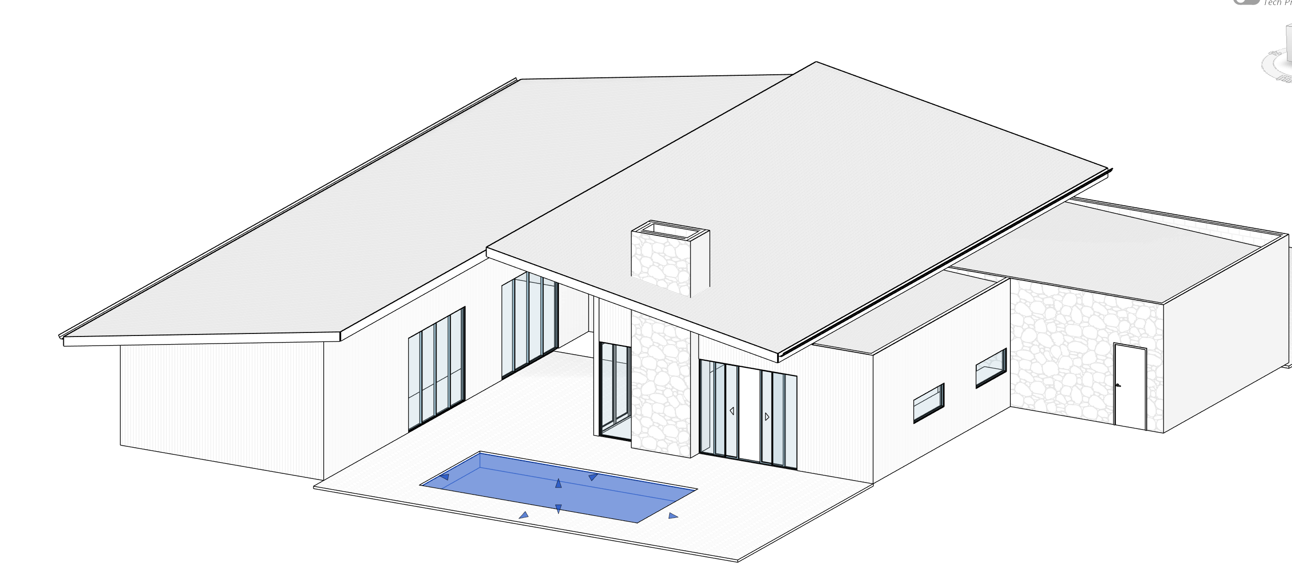 shou sugi ban cladding black to the house and stone cladding to the right side of the house add more landscaping to the front and swimming pool