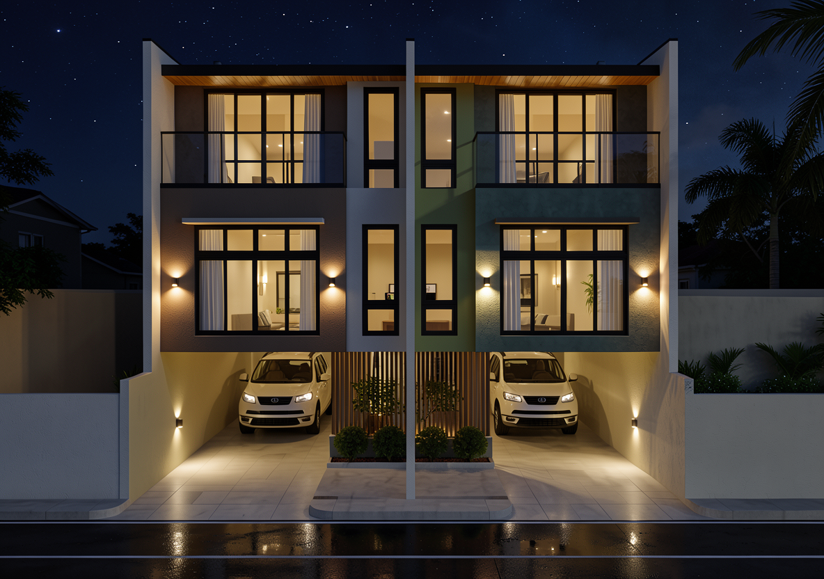red roof house with detailed architecture white walls and natural wood accents a green lawn surrounds the house decorated with small plants and flowers large patio with wooden furniture providing a cozy inviting atmosphere bright daylight setting clear blue sky and a peaceful serene vibe