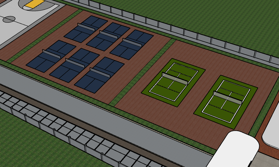 ultra realistic 4k aerial perspective rendering of a completed site development for a 2000 square meter institutional building the main building reflects a modern architectural style with clean lines metal cladding and a pitched roof based on the provided massing reference the site includes landscaped green lawns mature perimeter trees internal pedestrian pathways and outdoor sports facilities including a basketball court asphalt driveways and parking circulation loop around the site with realistic vehicles boundary fencing site lighting poles benches and people using the playground and sports areas are visible natural daylight soft shadows realistic materials high detail photoreal textures architectural visualization quality