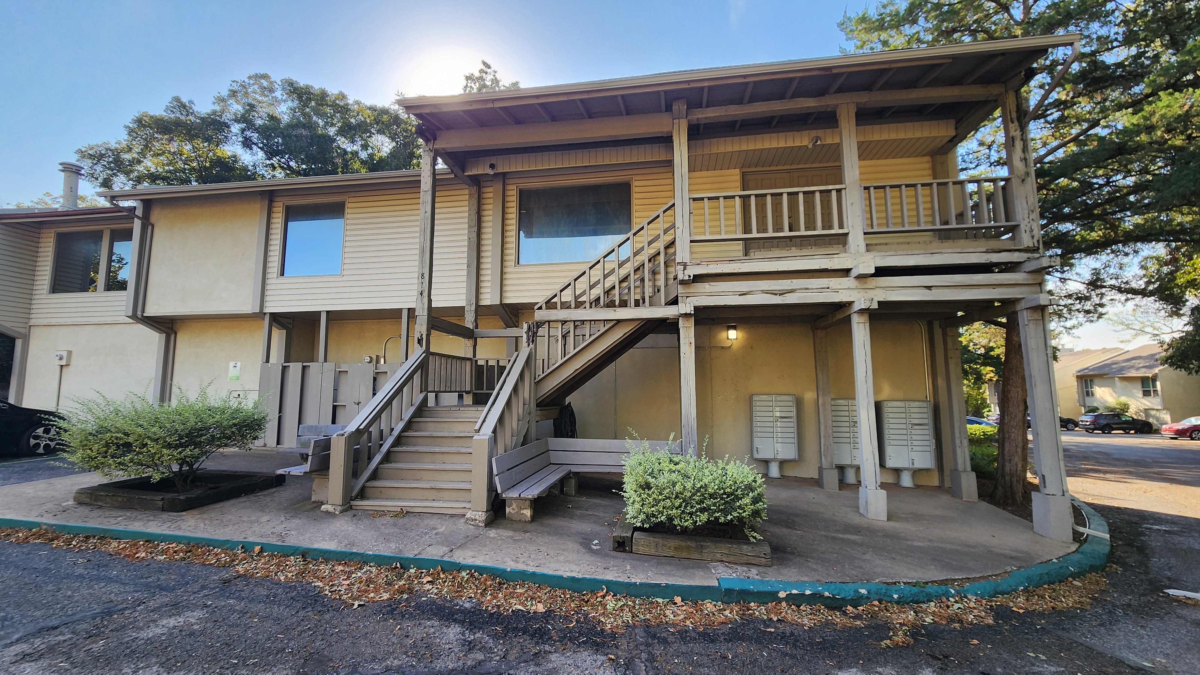 keep the configuration of the stair the exact same keep colors the same but make the stair look new wrap all the columns and roof soffit with hardi trim and soffit cover the stair treads and risers with trex material show new guardrails and handrails on the stair and upper deck as new