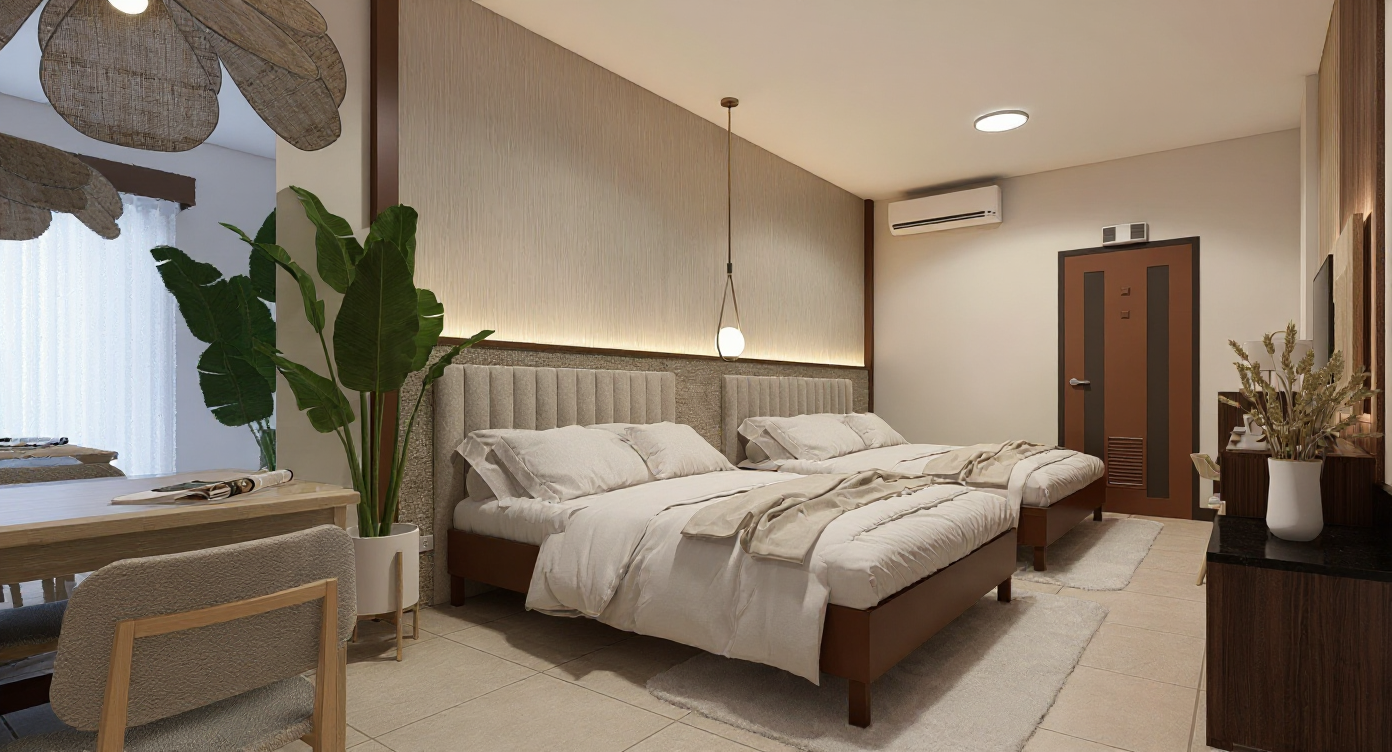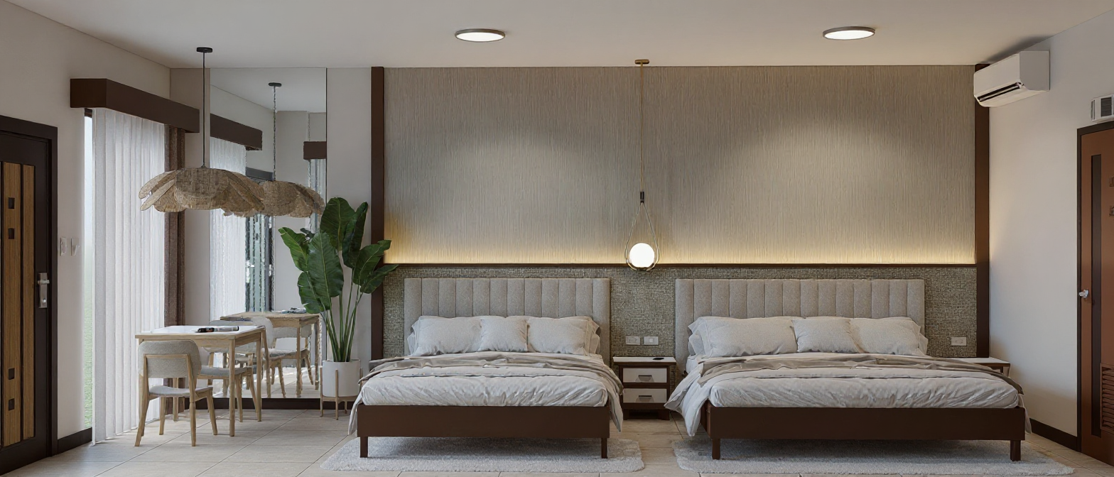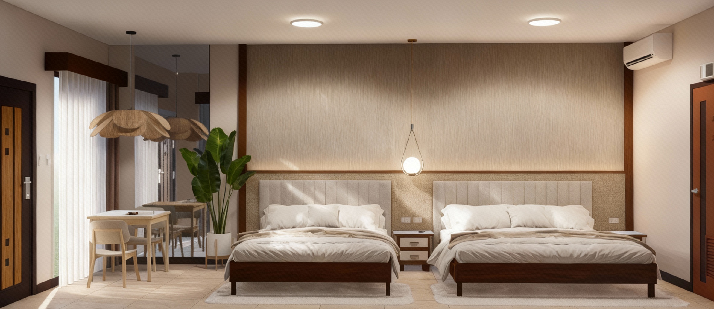 add cloud add people bali soft sunlight keep the signage font and shape keep the overall color feel architecture