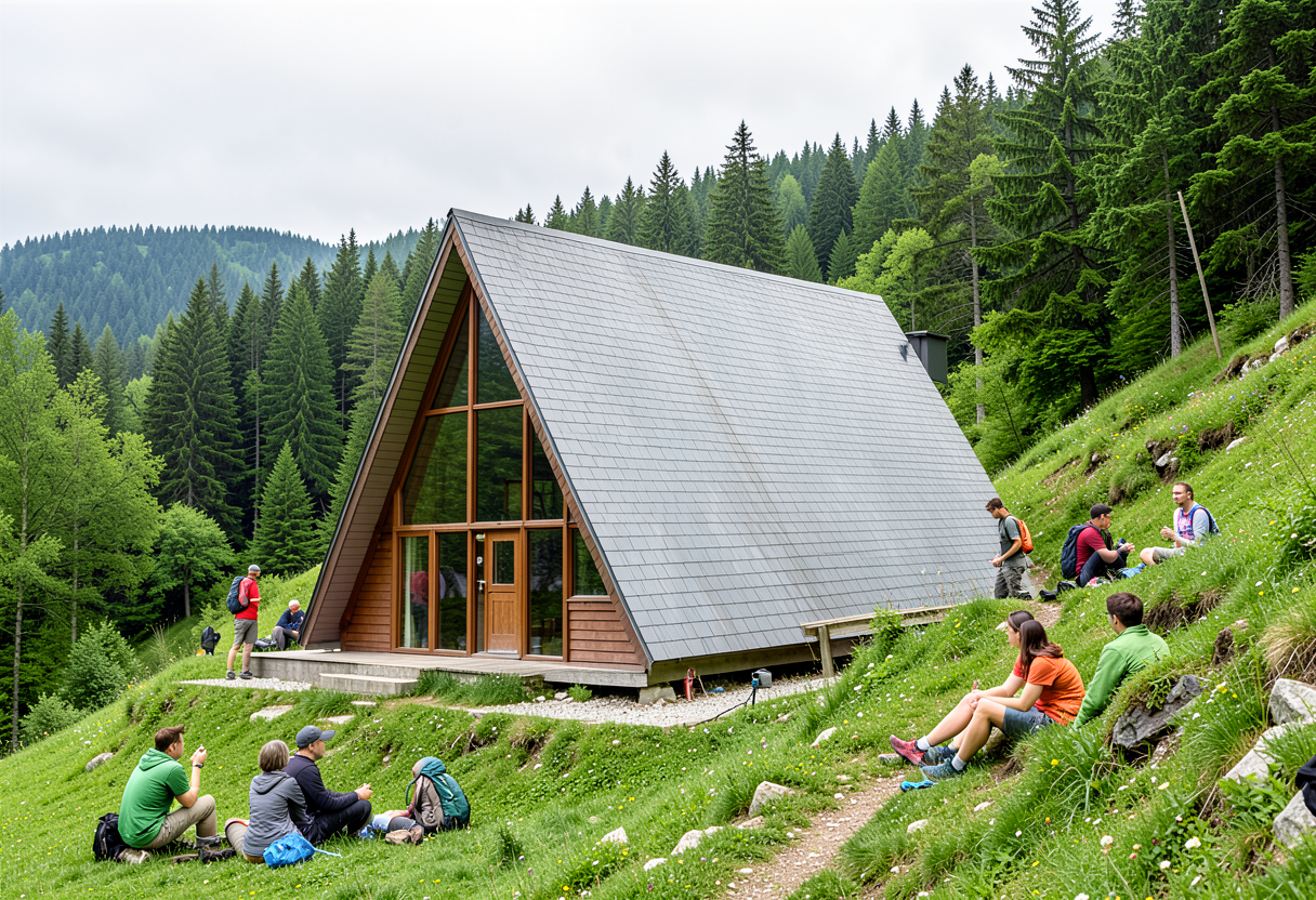 a mountain excursion cabin located on the slopes of mount ivan ica surrounded by lush green vegetation the cabin has brown wooden window frames and doors giving it a warm natural appearance the roof is gently sloped and covered in soft gray tones the terrain around the cabin slopes downward toward the right side of the scene behind the cabin a dense forest creates a natural backdrop in the foreground and around the cabin several hikers and excursionists are sitting and relaxing on the grass some talking others resting the environment feels peaceful and inviting realistic style natural colors spring or summer season soft daylight slightly overcast sky tranquil mountain atmosphere