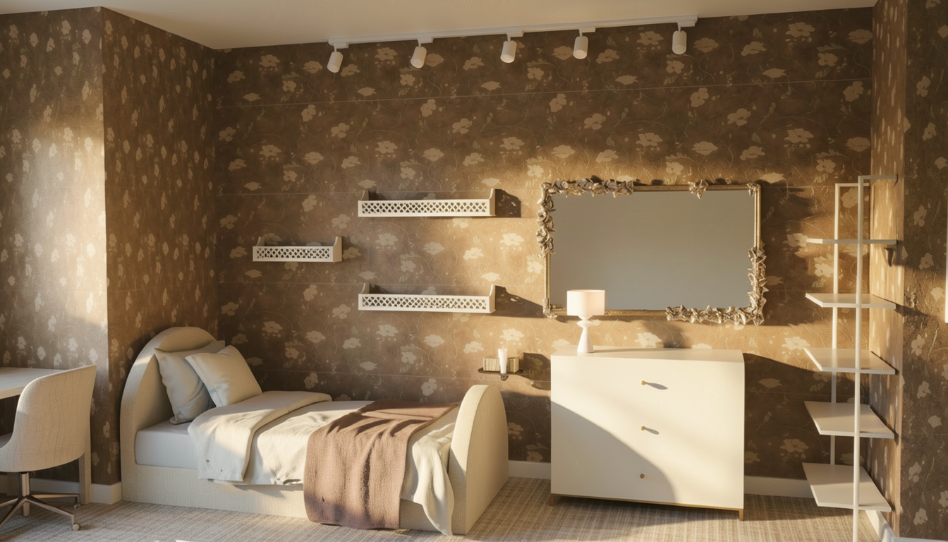 no windows present completely eliminate all natural light no sunlight no daylight no exterior glow use only artificial lighting sources any natural light in the scene is incorrect light fixtures are red maintain the exact tile color and tile dimensions from the original image without any changes keep all existing light fixtures unchanged in design position and color do not modify materials colors or lighting conditions keep the original mirror with wooden frame