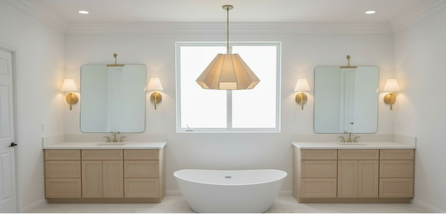 render a serene and elegant bathroom interior with a soft warm atmosphere feature a freestanding smooth white bathtub centered under a large geometric beige pendant light on either side place lightwood vanities topped with sleek white countertops each vanity includes a rectangular mirror framed in a subtle gold with matching gold fixtures add wall mounted spherical gold sconces with white fabric shades on either side of each mirror emphasize the calming ambiance with a harmonious palette of beige soft gold and white for an airy feel illuminated by gentle natural light streaming through a large window