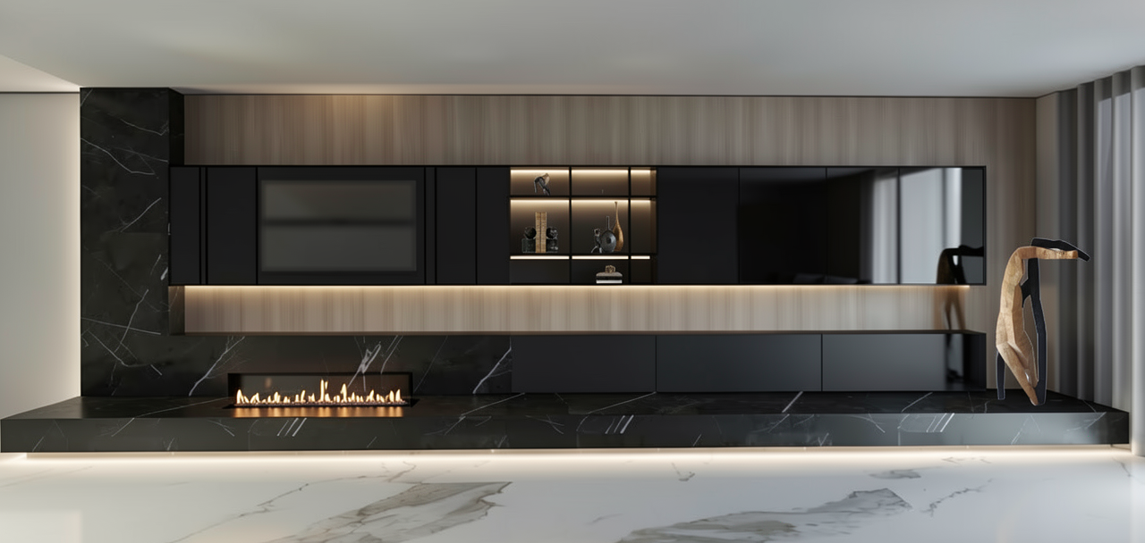 a high end living room composition with a strong emphasis on clean geometry premium materials and a dark luxurious palette the main elevation features a custom built wall unit spanning the entire width the base is defined by a continuous low profile structure in matte black seamlessly integrated with a black marble surface with subtle white veining extending horizontally to create a monolithic effect centered beneath the tv a linear bioethanol fireplace is recessed into the base element expressed as a sleek black rectangular opening adding a refined and minimal focal point above the composition is divided into horizontal layers a light tone wood panel runs across the top and midsection adding contrast and depth the central shelving area consists of open compartments made of black metal with a minimal thin frame construction giving an industrial yet elegant character on the right side a reflective rectangular surface is introduced using black tinted frosted glass creating a subtle mirror effect with low transparency and a soft diffused reflection frosted the cabinetry is finished in a combination of matte and satin dark tones charcoal to deep black with handle less flush surfaces to maintain a seamless aesthetic on the left side a vertical black marble element frames the composition visually anchoring the design the floor is finished in large format white marble carrara with soft grey veining enhancing the contrast with the darker wall unit lighting should be soft and indirect with hidden led strips accentuating the horizontal lines and material transitions creating a warm atmospheric glow that highlights the textures without overpowering the composition overall mood elegant minimal and exclusive a balance between contemporary luxury and architectural precision