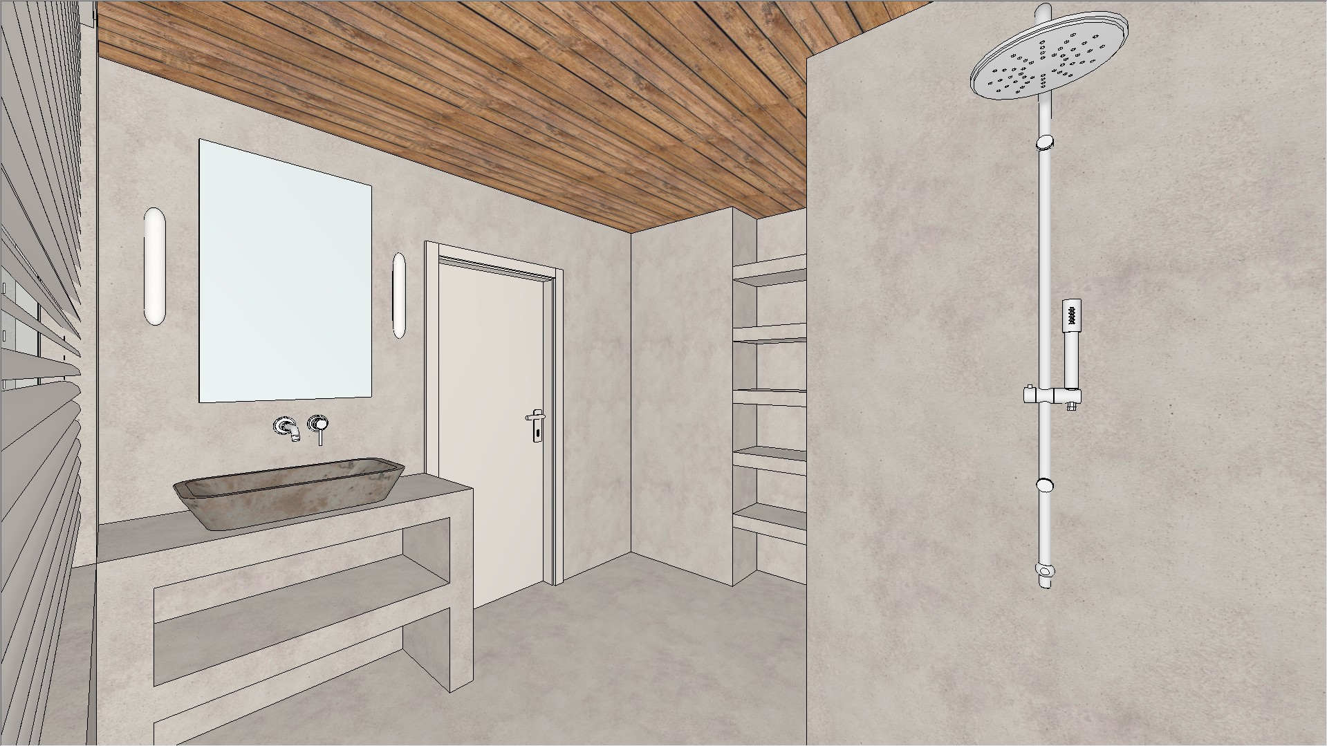 convert this simple colored 3d model into an ultra photorealistic render of a high end minimal luxury bathroom materials and surfaces ceiling natural sauna wood planks warm tone refined grain slight tonal variation perfectly aligned matte oiled finish realistic micro shadowing between planks all floors walls shelves and all built in volumes seamless mortex finish in light beige continuous surface without joints ultra matte soft cloudy texture subtle hand applied irregularities slightly warm undertone perfectly blended transitions between planes door mdf lacquered finish color perfectly matching the mortex tone on tone smooth satin finish minimal detailing flush with wall washbasin solid natural stone light tone soft honed finish not glossy subtle veining realistic edge thickness mirror crystal clear mirror no tint sharp reflections frameless and minimal fixtures shower and faucet brushed stainless steel rvs fine brushed texture accurate reflections slightly diffused highlights subtle imperfections no chrome look make sure the shower is very realistic toilet villeroy boch viclean wall mounted sleek and minimal correct proportions styling add a few neatly folded towels on wooden shelves soft fabric neutral tones beige cream naturally placed slightly imperfect stacking lighting critical highly realistic architectural lighting setup combination of soft indirect ambient lighting and very subtle accent lighting integrated minimalist wall lamps sleek linear or cylindrical very clean design emitting warm white light 2700 3000k soft natural daylight entering indirectly diffused no harsh sunlight accurate global illumination soft shadow gradients realistic light falloff subtle reflections on mortex and stainless steel no overexposure rendering quality ultra photorealistic high end architectural visualization physically accurate materials pbr micro imperfections edges slightly softened no perfectly sharp geometry no plastic look no exaggerated glossiness realistic depth contrast and atmospheric balance camera eye level perspective slight wide angle natural no distortion calm balanced composition emphasizing materials and spatial harmony negative prompts constraints avoid plastic materials avoid overly glossy mortex avoid unrealistic reflections avoid harsh or artificial lighting avoid perfect uniformity add subtle realism