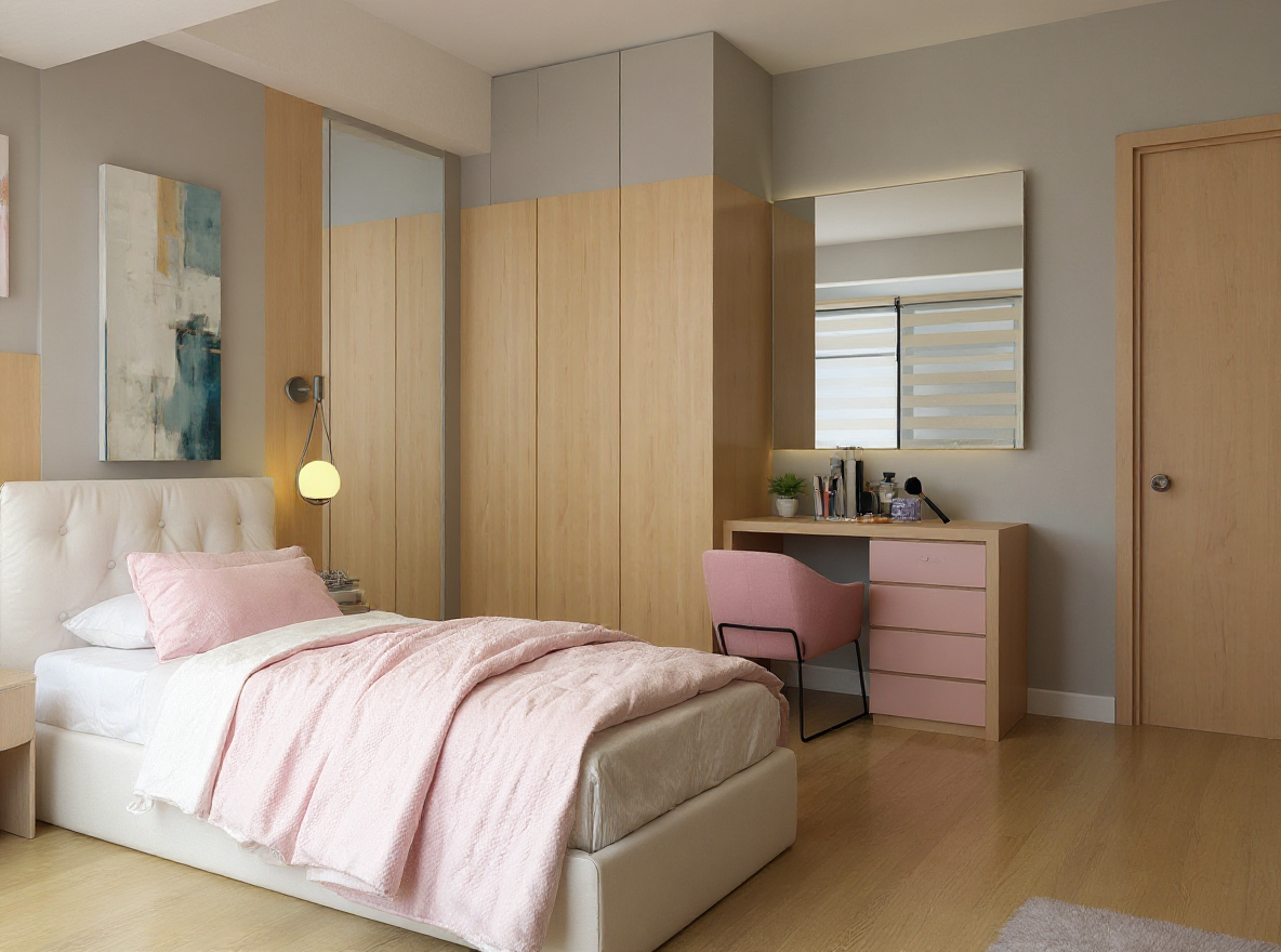 maintain details add a few trees outside the window retain blinds beddings light pink and white
