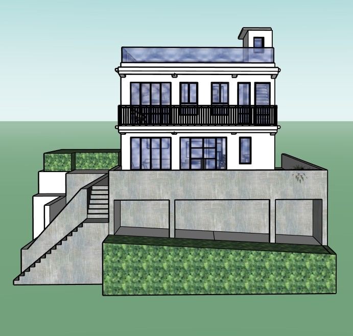 green is vegetation window frames are black textured blue is glass black 20mm box section balustrade white render to house grey is concrete add a forest and mid day blue sky