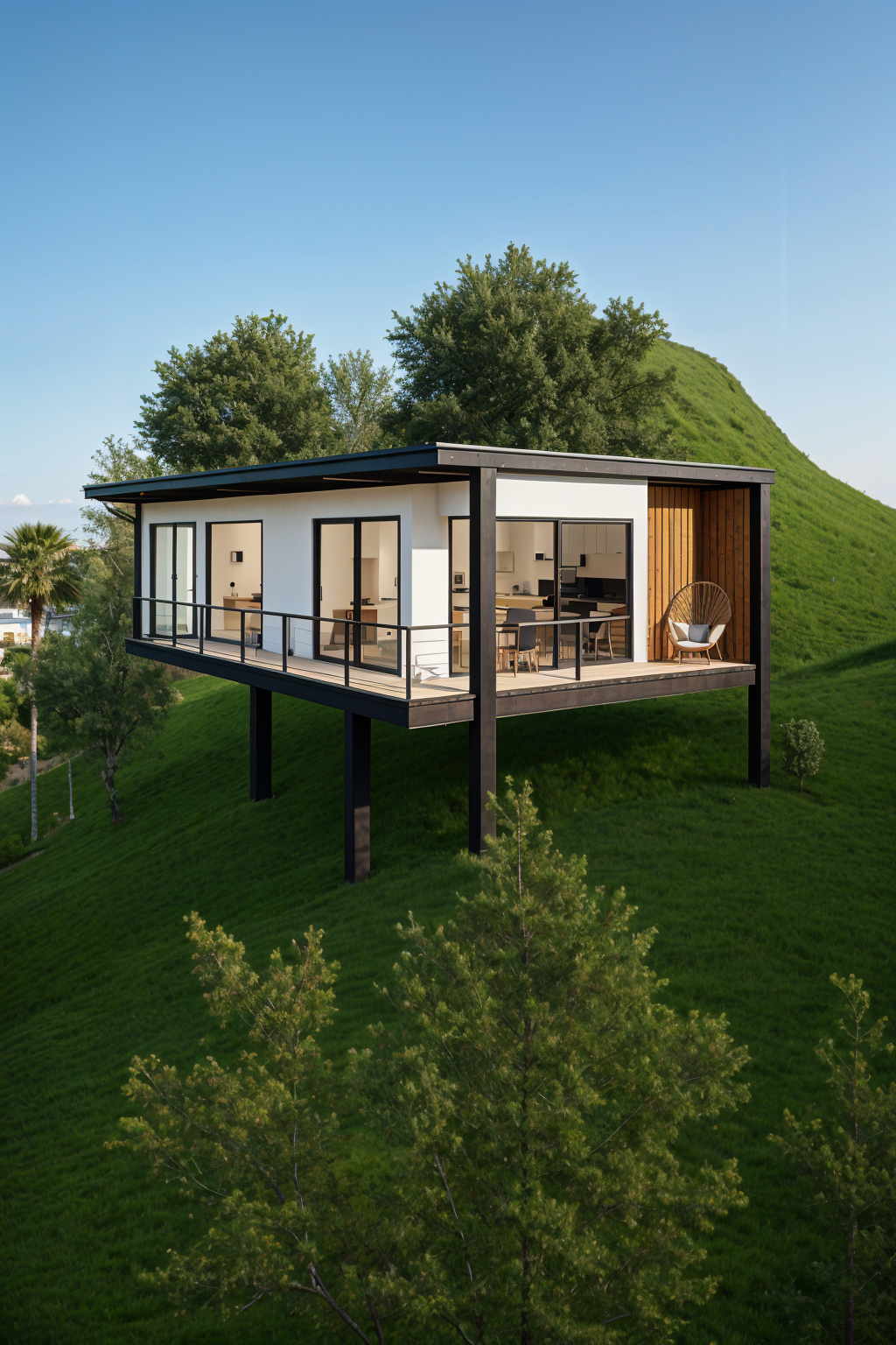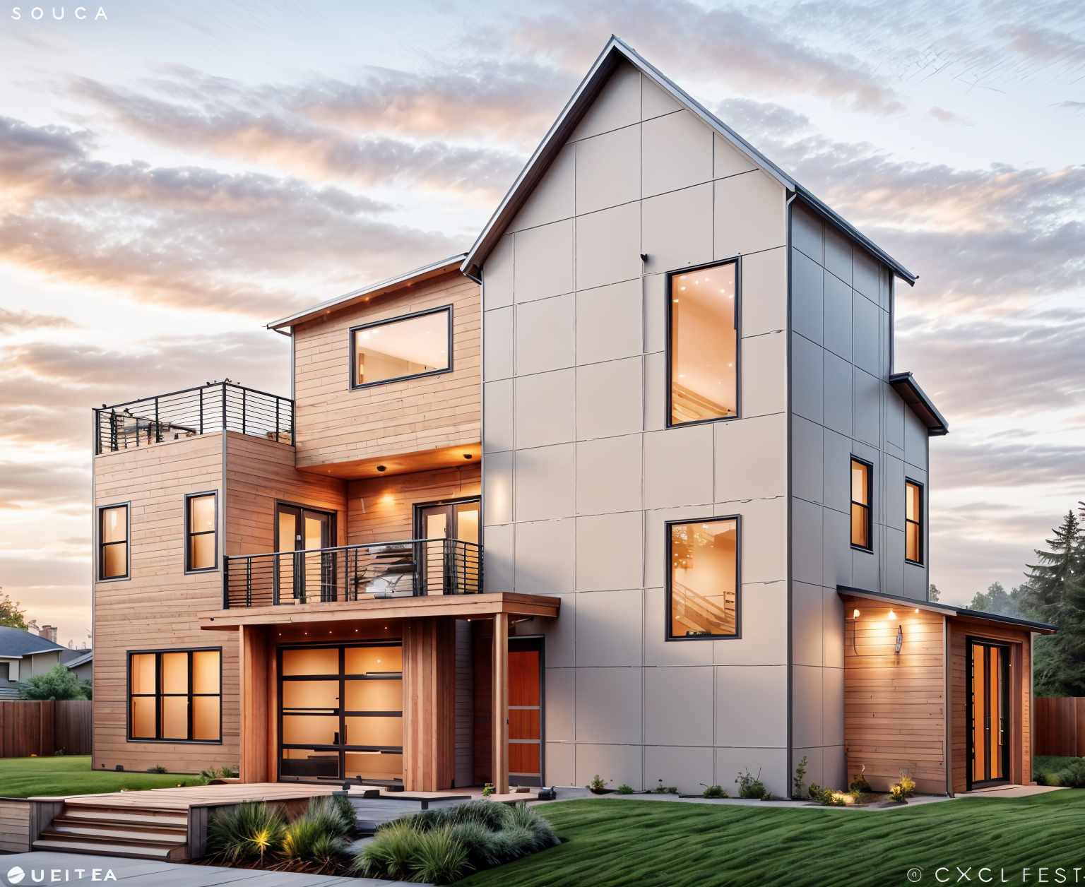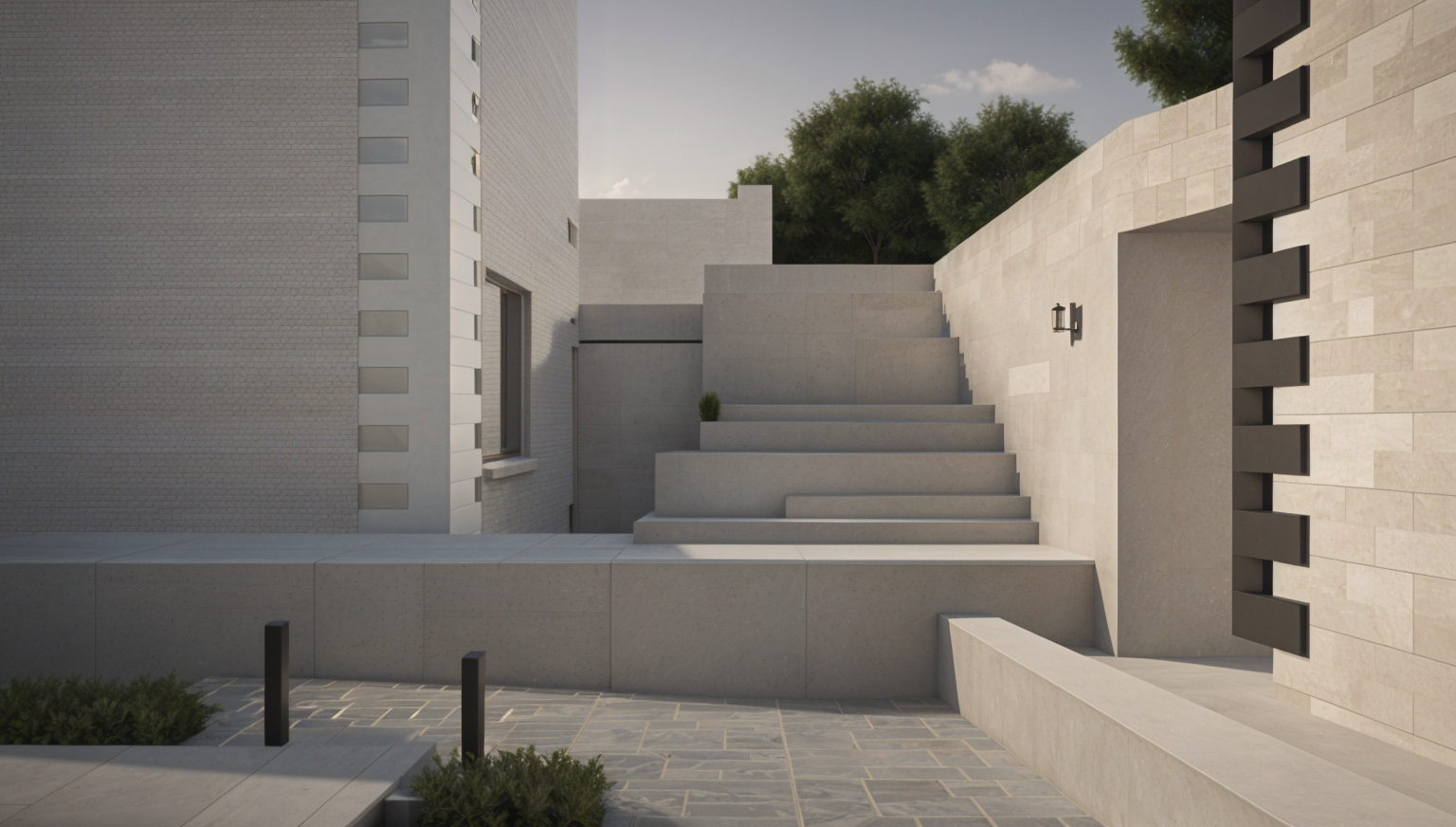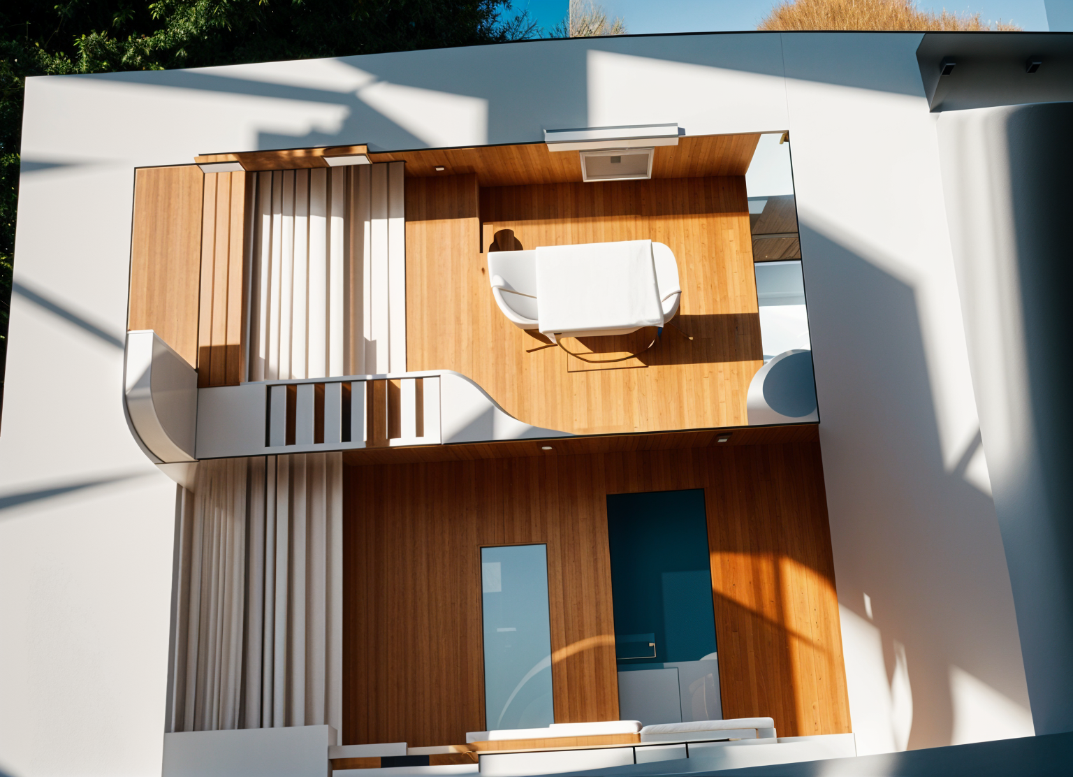 render an elegant modern house with a central outdoor pool surrounded by minimalist architecture use white and light gray tones for the building illuminate the pool with a serene aqua blue creating a refreshing yet sophisticated vibe incorporate beige and light brown for decking and surrounding elements adding warmth to the space capture soft natural sunlight casting gentle shadows adding depth and an inviting atmosphere include subtle green plants to introduce a touch of nature