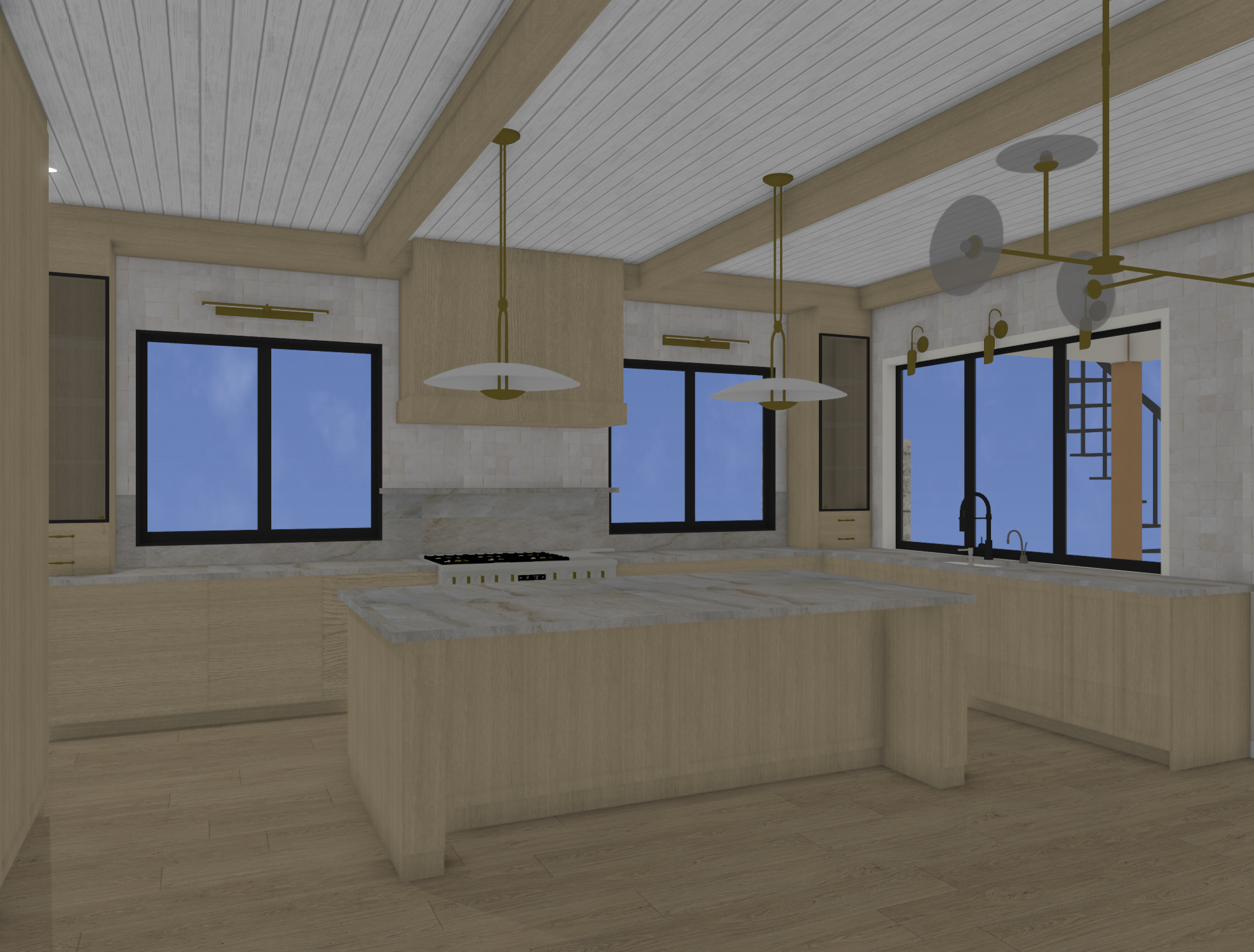 light oak cabinetry ambient lighting white plank ceiling betewen wood beams