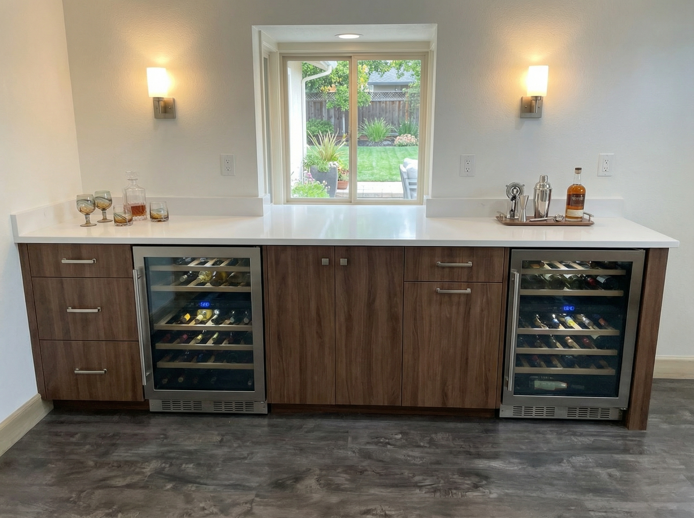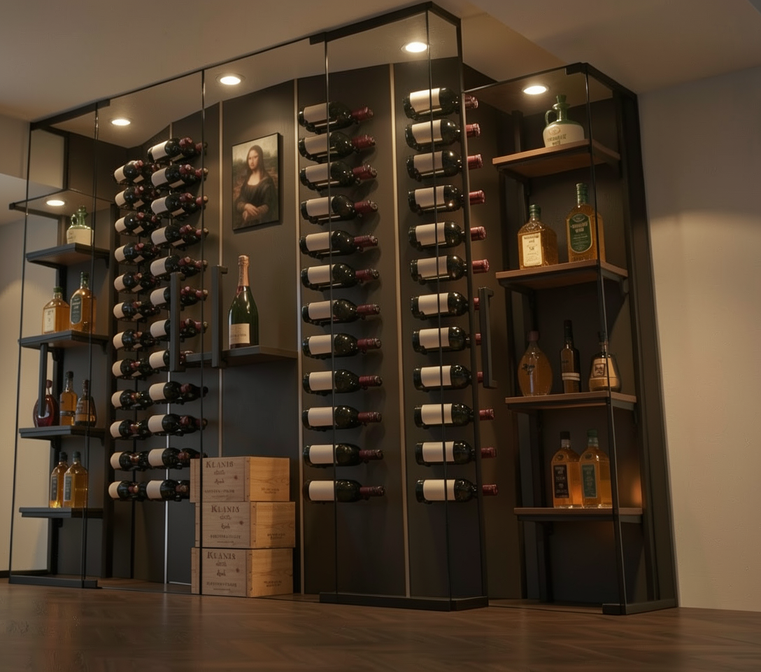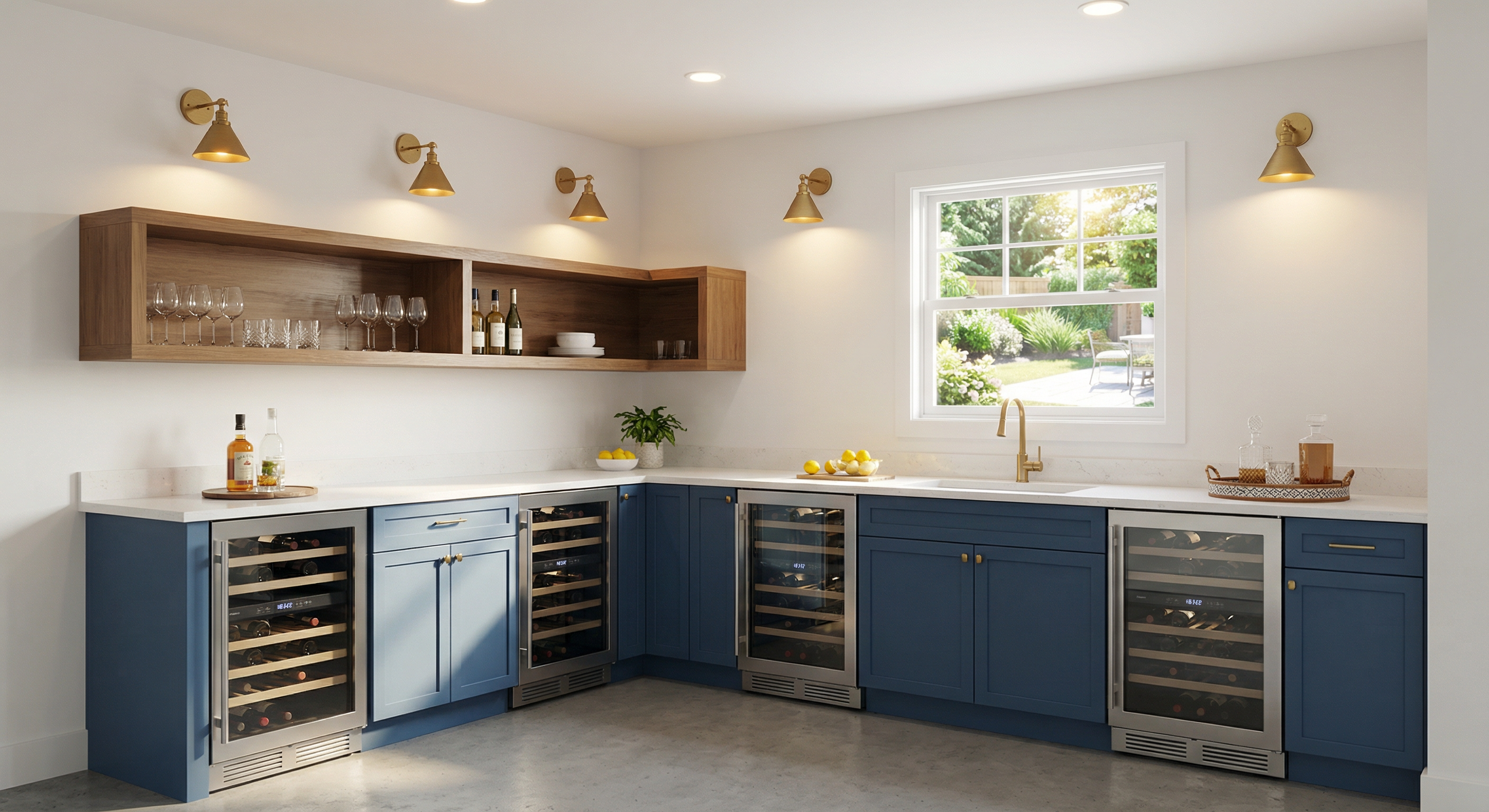 interior nook with navy blue cabinet swavorski crystal cabinet knobs white marble crystal glass wear clear wine glasses white decor gold shelf brackets clear glass shelves white espresso maker