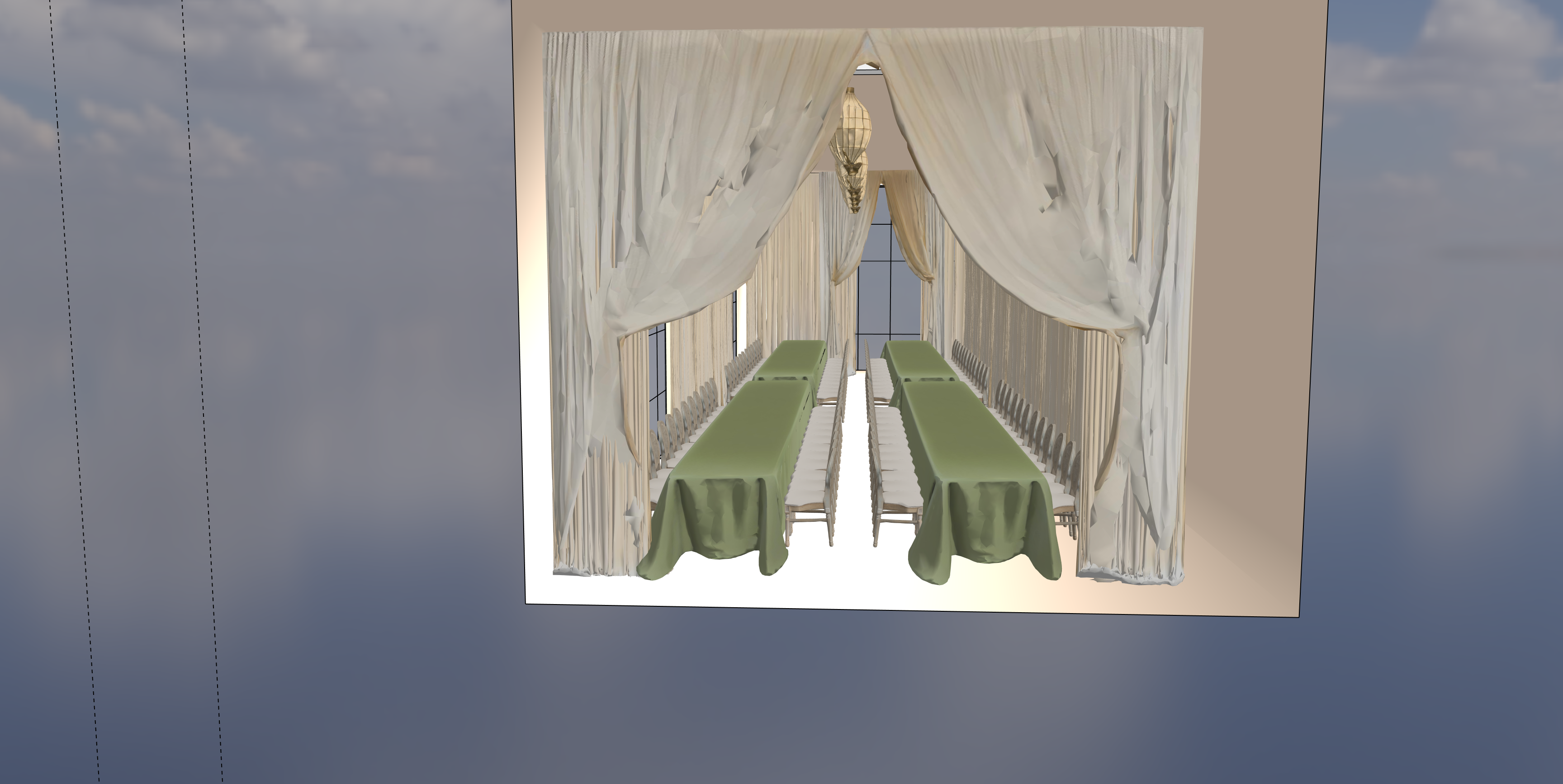 create a photorealistic rendering of the provided sketchup model important the sketchup model is the final design reference and must be preserved exactly do not change or reinterpret the geometry do not redesign the scene do not add objects keep the architecture exactly as in the model columns beams windows openings staircase room size and proportions must remain identical do not extend the room or modify the structure all furniture and objects must remain exactly in their original positions tables the tables must have only the dark forest green floor length tablecloth exactly as shown in the model no table settings no plates no glasses no cutlery no decorations fabrics render all fabrics as lightweight sheer chiffon or voile fabric the fabric should appear soft airy and naturally flowing all draping positions openings and window reveals must remain exactly as in the sketchup model do not change how the fabric is arranged lighting and materials enhance the scene only with realistic lighting shadows and textures style photorealistic architectural interior photograph natural daylight realistic materials detailed fabric folds use the sketchup model strictly as the structural reference preserve all geometry exactly do not add table settings do not change furniture do not change draping positions do not modify architecture