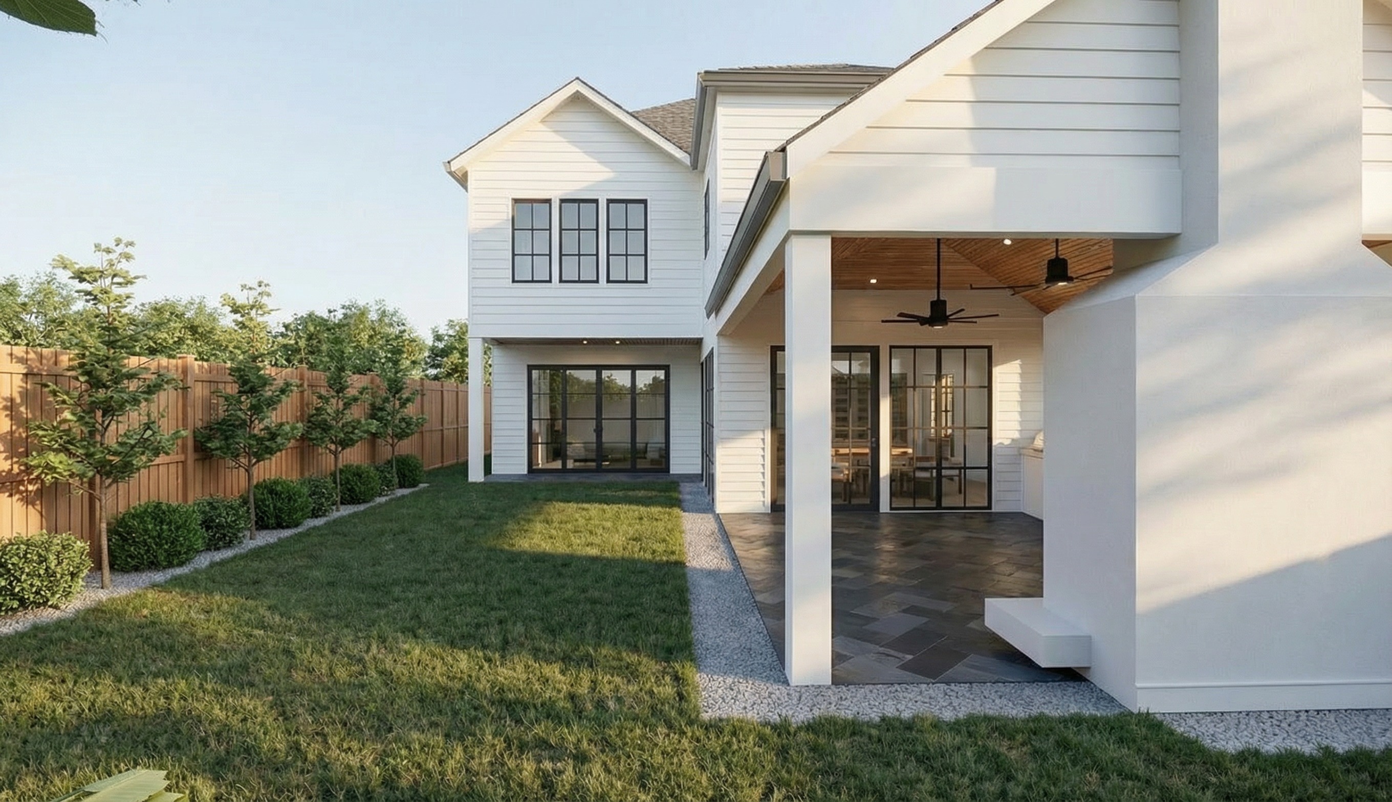 update this image by adding a rectangular swimming pool tanning deck and rear pool deck only maintain the exact architecture layout geometry porch landscaping materials and all existing elements exactly as shown do not modify or move the house porch hardscape planting or any other features add a clean rectangular pool placed naturally within the existing yard layout the pool should feel properly scaled and integrated into the space include a tanning deck sun shelf within the pool at one end the tanning deck should appear minimal shallow and refined add a pool deck surrounding the pool using natural high end materials that complement the existing exterior palette add a small number of upscale tanning lounge chairs placed only at the back edge of the pool deck away from the house and porch the lounge chairs should be minimal and refined in design neutral in tone soft whites warm neutrals consistent with restoration hardware style outdoor furniture do not place any furniture under the porch do not add furniture near the house columns or covered areas keep the number of lounge chairs limited and intentional to avoid clutter water should appear clear calm and realistic with subtle reflections and gentle movement do not add additional landscaping structures umbrellas or accessories beyond the pool deck and rear lounge chairs do not change any existing materials or site elements the final image should appear highly realistic clean and editorial as if professionally photographed for a luxury real estate listing avoid distortion or unrealistic proportions the pool and deck should feel naturally integrated and properly scaled within the existing yard appear highly realistic clean and editorial as if professionally photographed for a luxury real estate listing avoid distortion or unrealistic proportions the pool and deck should feel naturally integrated and properly scaled within the existing yard