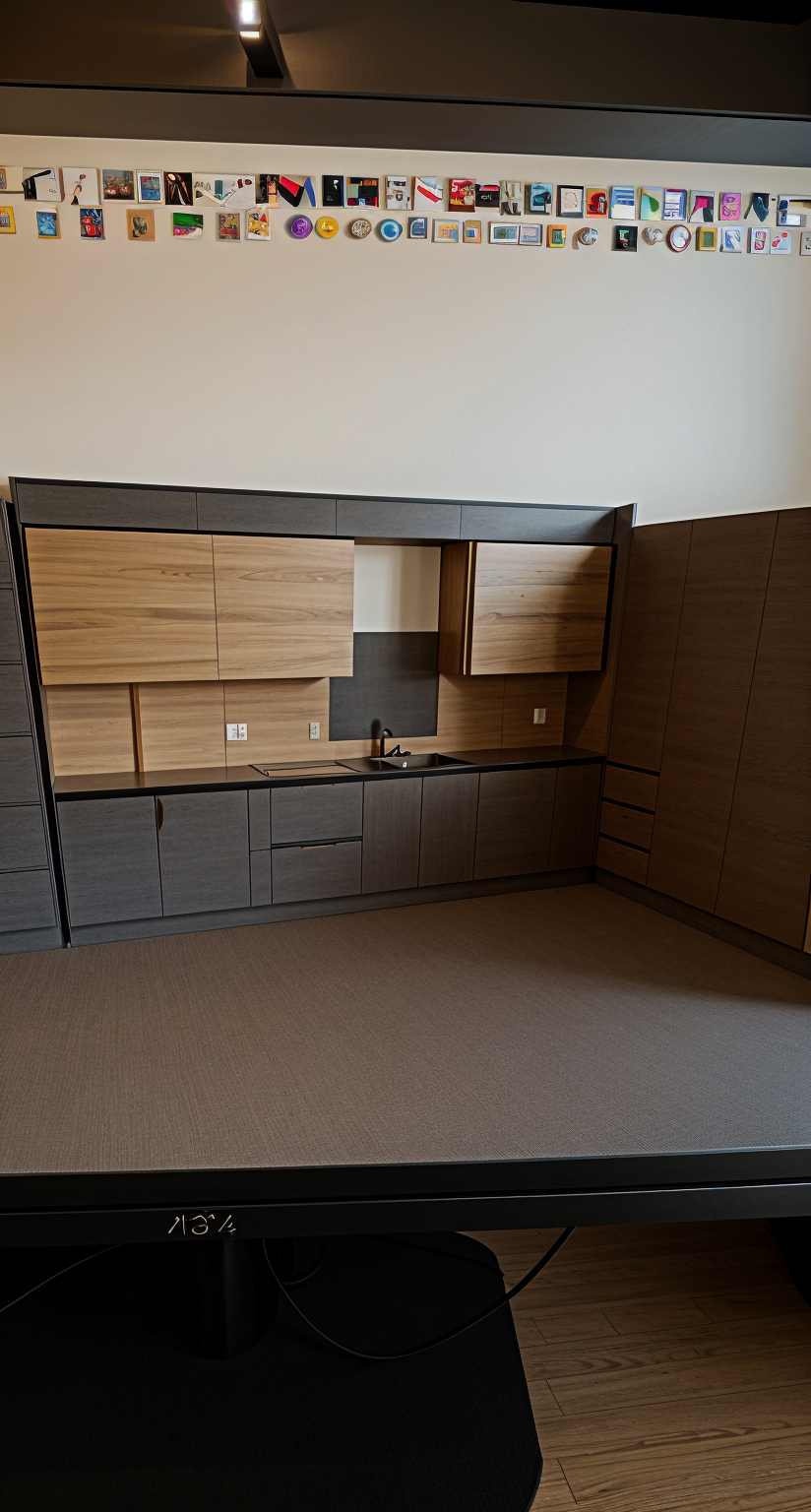design a striking high end kitchen featuring a wow factor waterfall edge island made of dark natural stone with beautiful veining reflecting a super modern luxury aesthetic include a modern hood vent that has light cream beige natural stone cover with no architectural ornate details with the same stone added to the backsplash