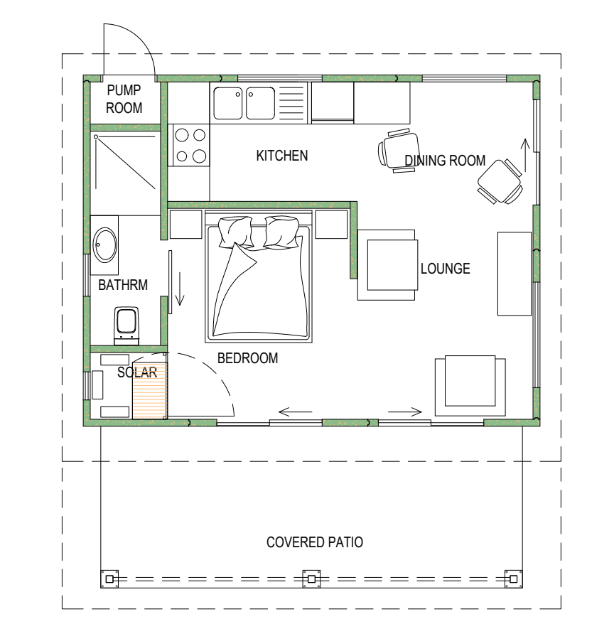 convert this floor plan into a architectural isometric 3d view of a full house show the space from an elevated angle with furniture walls and details visible precast concrete lodge in bushveld setting use the same furniture as shows on the plan do not change the orientation of the floorplan