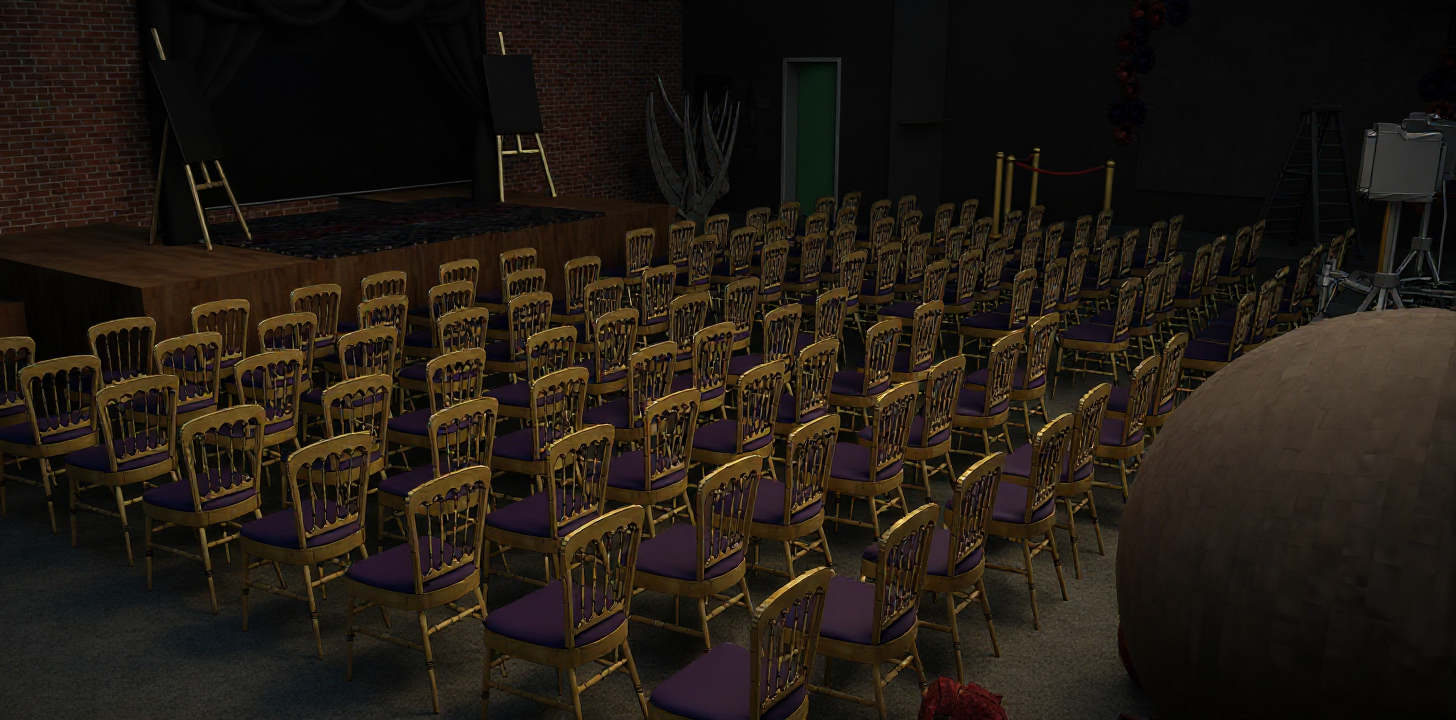 make photorealistic add lighting ceiling make speakers and dg booth back color