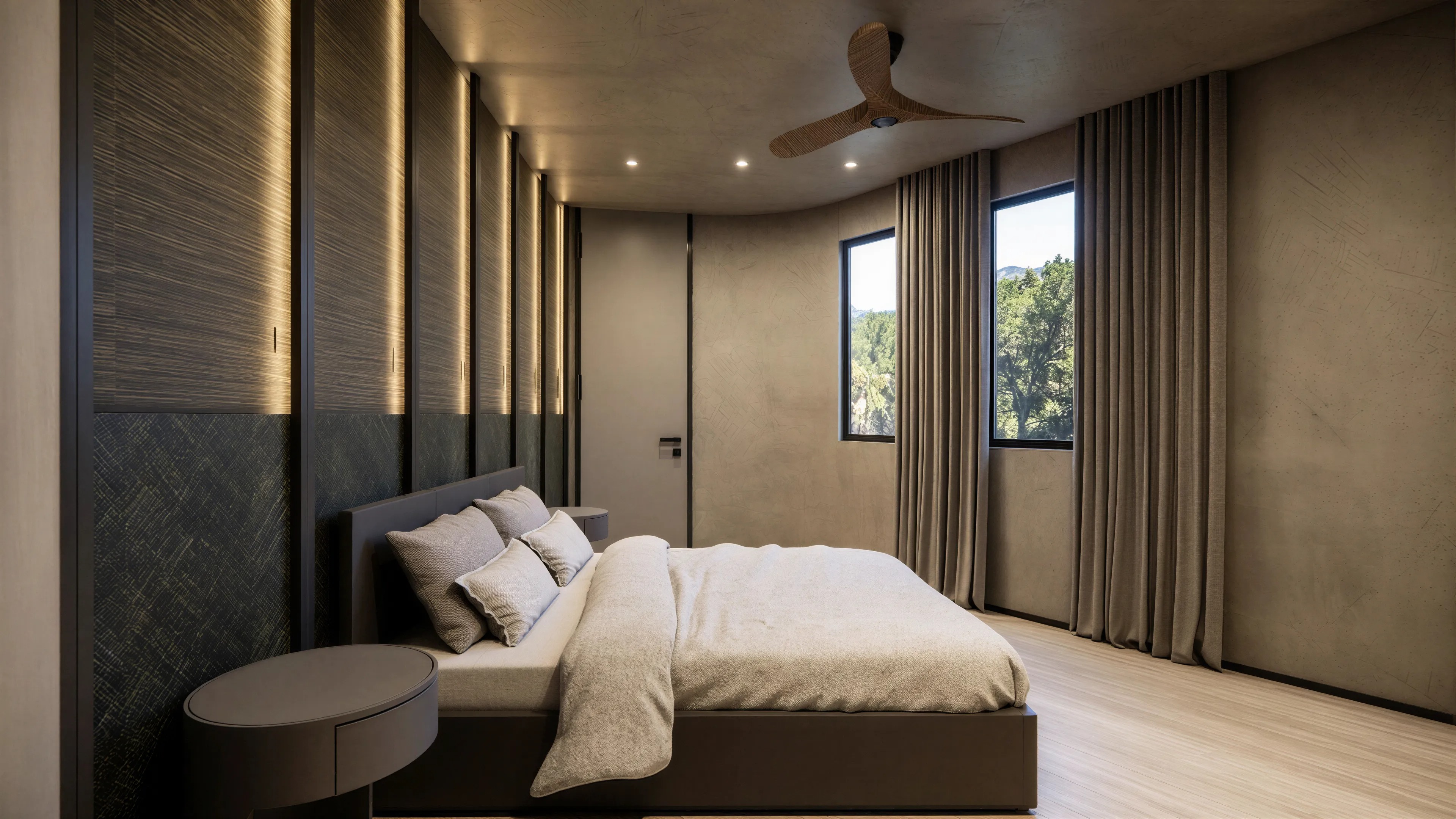 transform this 3d render into a hyper realistic professional architectural photograph while preserving exactly all original materials textures colors and proportions critical material fidelity maintain 100 the original travertine natural stone flooring same tone veins finish maintain exactly the natural wood ceiling fan same color grain and finish do not change any wood stone concrete fabric or metal tone do not alter the color palette do not modify geometry or camera angle only convert render look into real photography look lighting logic based on visible windows if windows are visible strong natural sunlight entering only through existing openings defined shadows from window frames sun patches on floor and walls blue vibrant sky visible outside natural contrast between sunlit and shaded areas if no windows visible bright diffused daylight no direct sun beams uniform clear illumination 5500 6500k photographic settings canon eos r5 24 70mm lens f 8 iso 100 1 250s mid afternoon daylight realism enhancement add subtle micro imperfections barely visible realistic reflections on glass and metals natural fabric folds subtle ambient occlusion high dynamic range architectural digest style add minimal elegant decoration books organic objects natural plants respecting the original palette one person naturally integrated in the scene well dressed neutral clothing interacting calmly with the space sitting on the bed or walking near the window the person must feel candid and realistic not posed final result a premium architectural magazine photograph indistinguishable from a real professional photo with total material fidelity and physically correct lighting