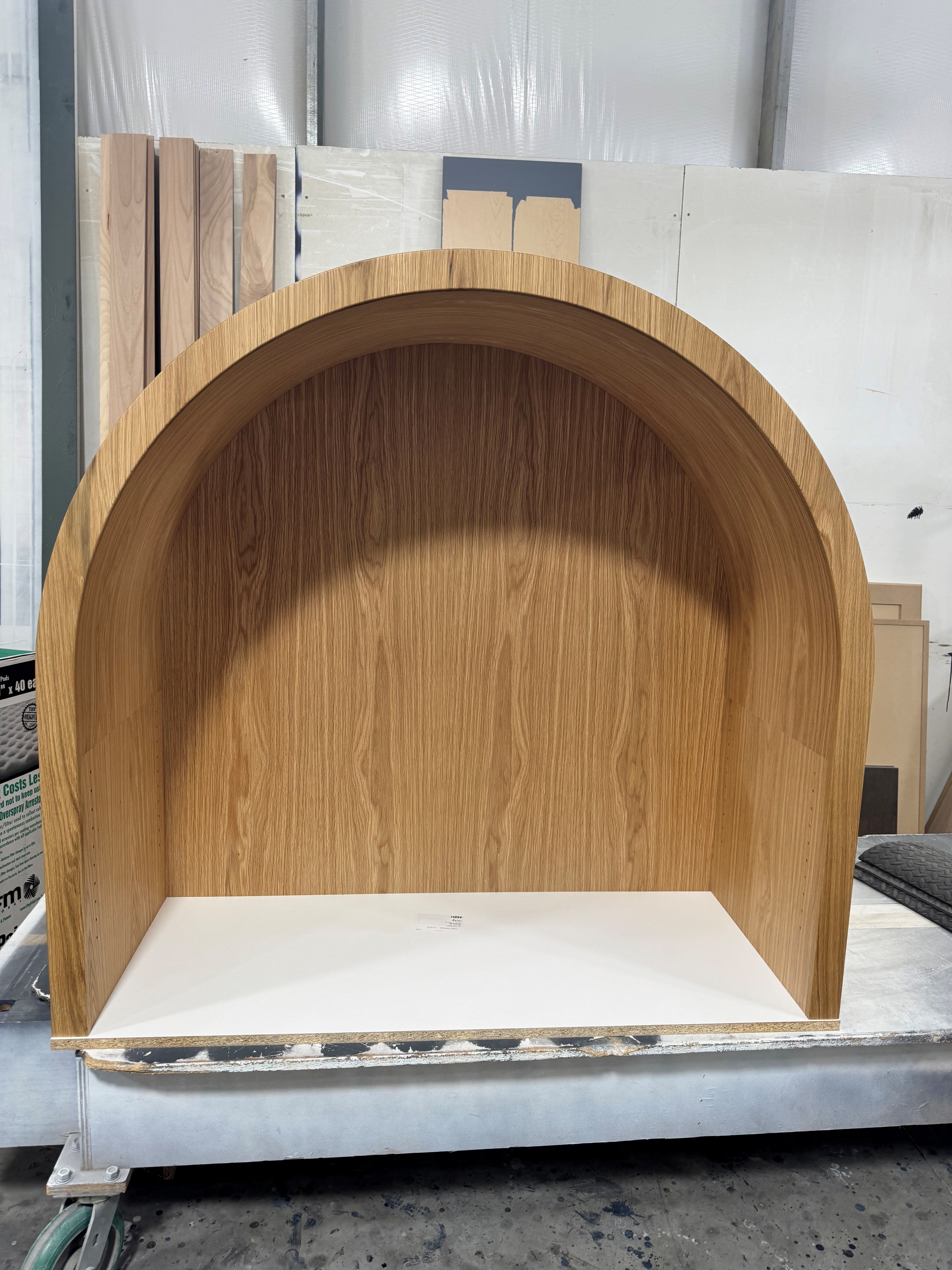 do not change the cabinets in any way preserve the exact cabinet colors materials finishes dimensions door and drawer styles hardware spacing alignment and all geometry exactly as shown do not alter the countertop shape backsplash appliances flooring lighting fixtures or wall structure only remove the construction materials clutter and mess from the scene clean the room and make it look finished and staged add a few simple tasteful home accessories appropriate for the style of the space but do not add or remove any furniture windows or architectural elements maintain the original lighting direction and realism enhance clarity and polish the photo while keeping the cabinetry and room design completely unchanged do not alter the lighting to keep the cabinet colors as they are in the image change the white bottom to quartz so that the arch is sitting on the countertop and blur out the background as if it were drywall stage the white quartz with simple modern decore do not expand the image at all put this arch in a drywall recessed opening so that the drywall arches around this piece