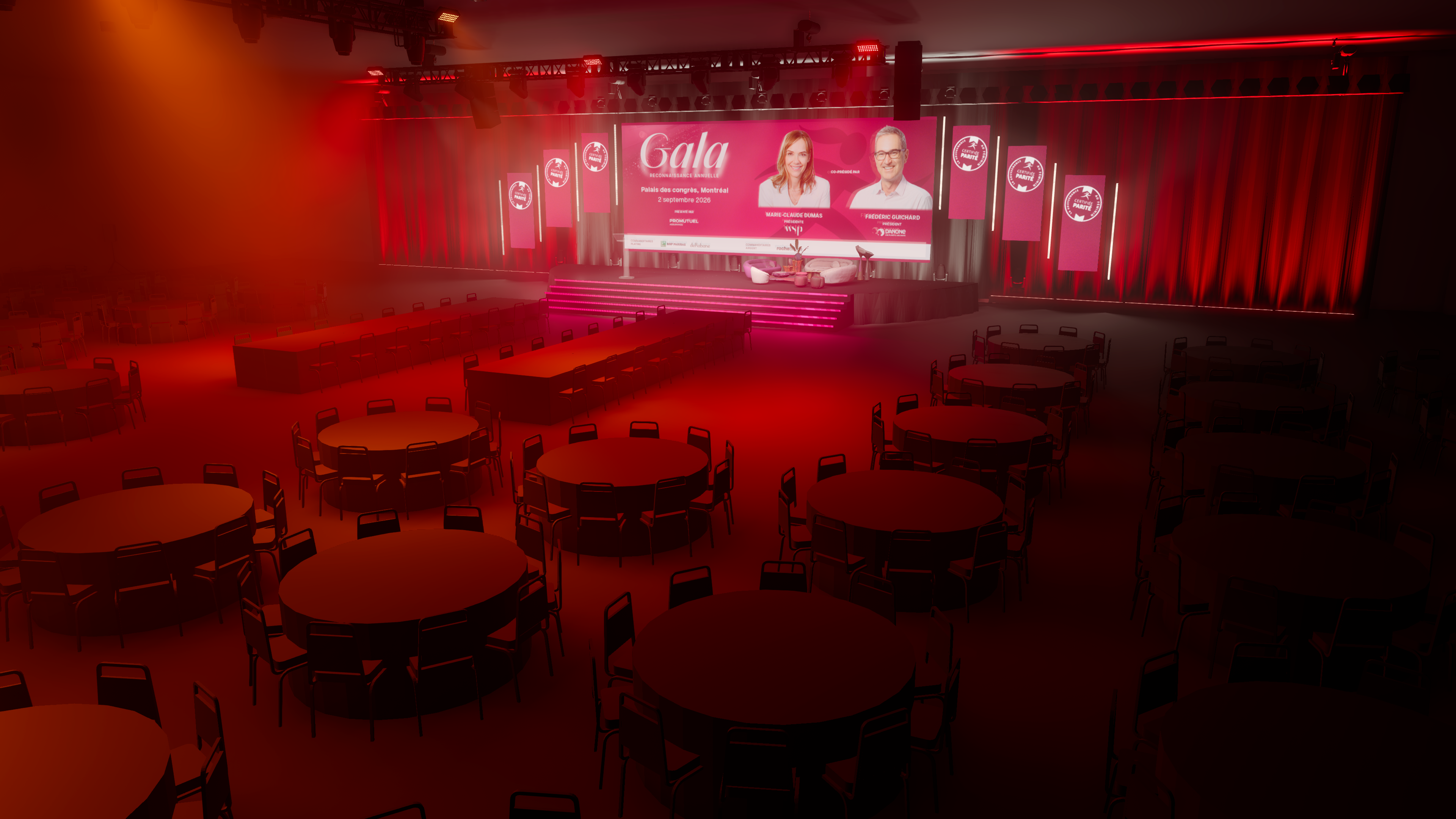 voici la version mise jour du prompt avec le souper int gr keep everything exactly identical to the original scene architecture layout lighting materials led screens reflections camera angle and composition do not modify any existing elements add a corporate audience composed of business professionals dressed in formal attire suits dresses elegant business wear the crowd should feel natural and upscale slightly increase the proportion of women to reflect a female leadership governance event while keeping a realistic mix add small groups of attendees standing and interacting naturally networking posture as well as some seated guests if applicable maintain clear sightlines to the stage on the round stage add a female keynote speaker standing behind a lectern podium delivering a speech she should have confident body language mid presentation posture facing the audience on the tables add a refined dinner setup plated meals being served or already placed elegant tableware plates cutlery wine glasses napkins and subtle decorative elements the food should look upscale and appropriate for a corporate gala dinner no clutter clean presentation ensure realistic scale lighting and shadows integration for all added people and table elements keep the atmosphere professional refined and high end do not add any people on the stage other than the speaker do not modify stage dimensions or existing design elements