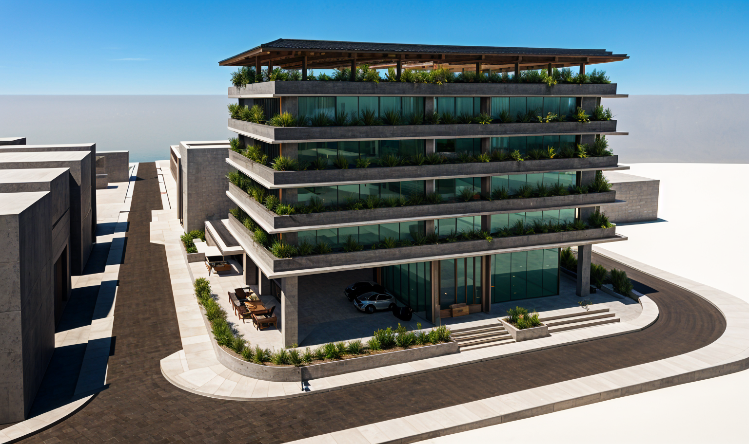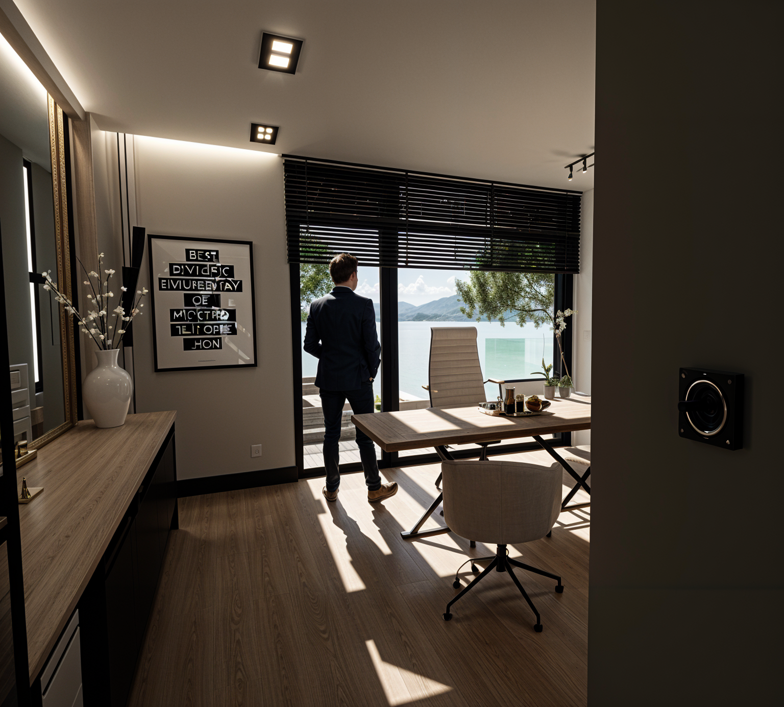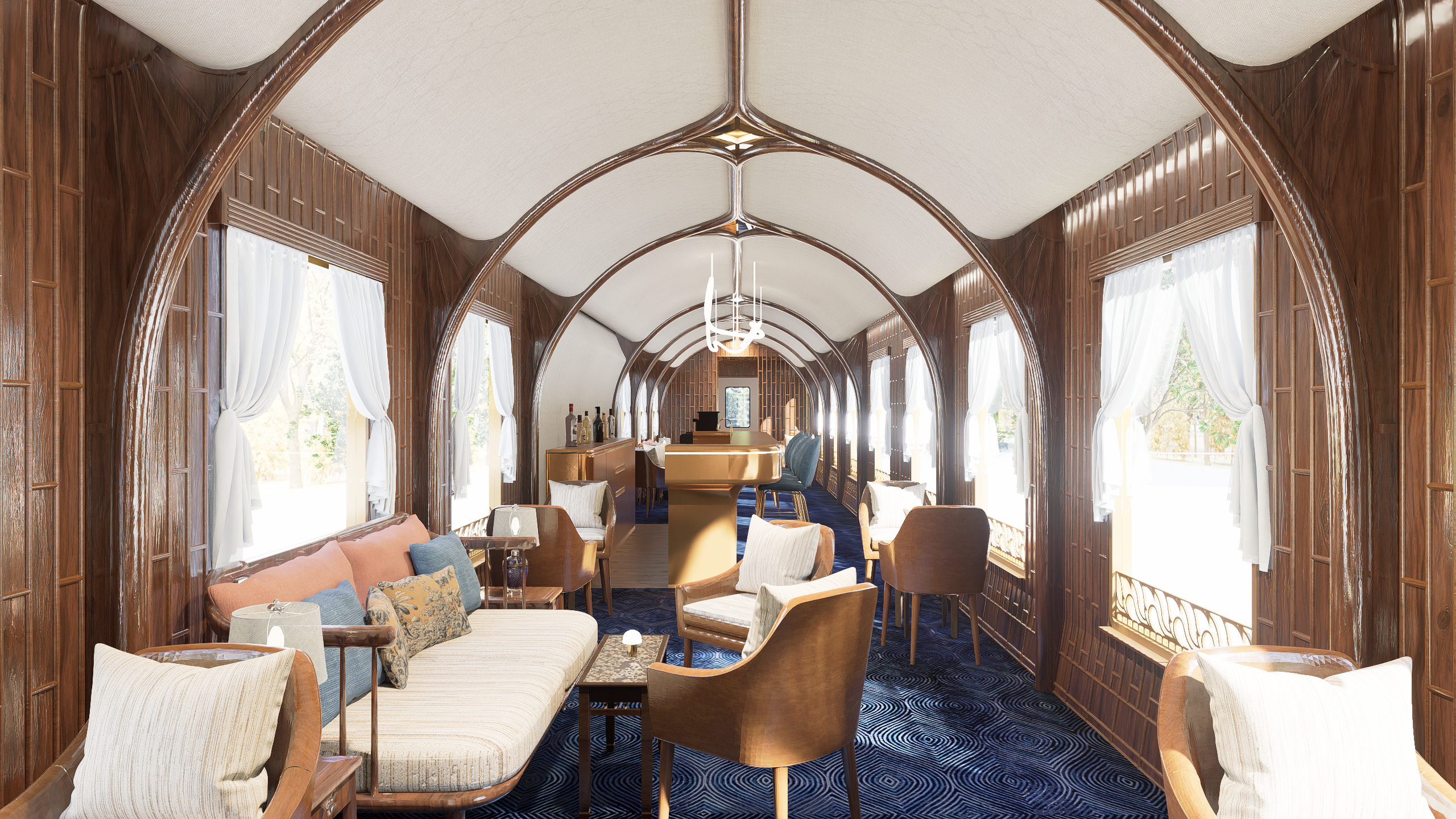 render interior shot thai contemporary and luxurious style comfortable chair teak wood material fah pakhon wall blue carpet landscape view outside of the window white fabric ceiling