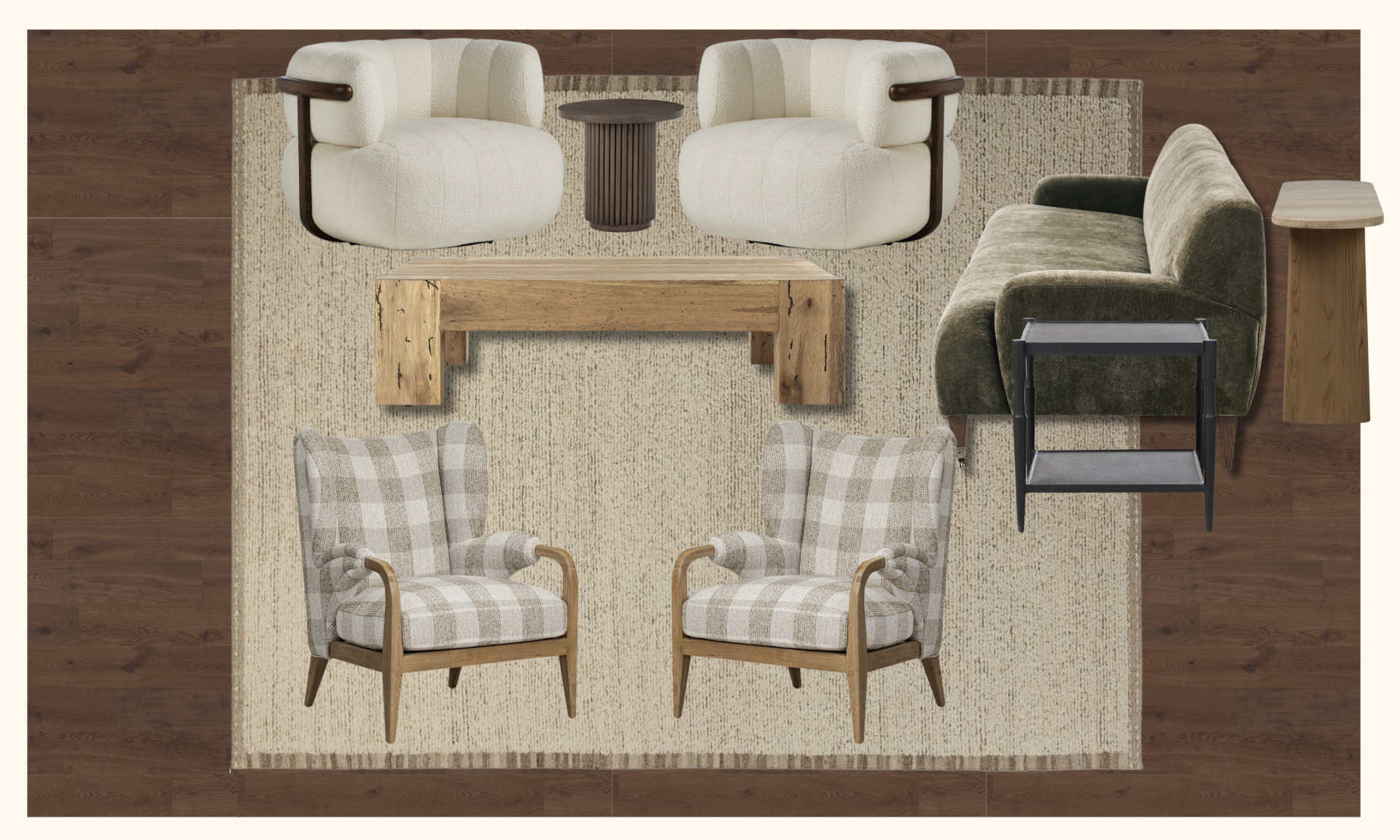 this room will have floor to ceiling windows showcasing the mangroves of anna maria island input the furniture oriented the way the moodboard portrays the ceilings are 20 heigh and there is an opening on the right wall that is encased with reclaimed wood beams there should be floor to ceiling drapes on opposite sides of the large windows the ceilings will have a red grandis tounge and groove wood on it on the left side wall there is a transom window at the very top of the wall that goes from wall to wall and is about 3 wide this wall will also have large creamy flagstone on it that goes to the bottom of the transom window with a solid limestone fireplace there is inset cabinets on either side of the fireplace as well that are about 8 in height match the layout of the furniture in the mood board in the room add some pillows and blankets where needed on the furniture to add texture add a chandelier hanging over everything centered in the room add plants were needed and pretty rustic pots as accessories make this house a contempory rustic modern feel this house is on anna maria island florida
