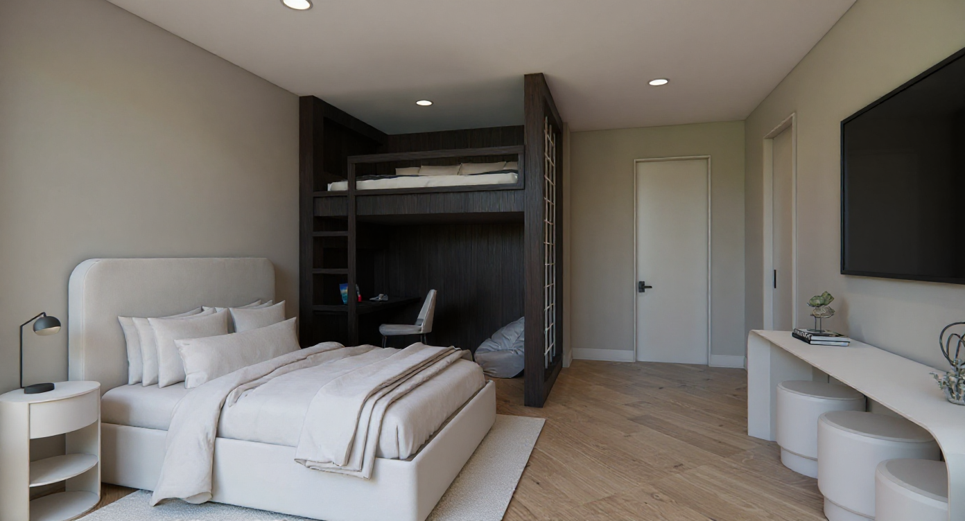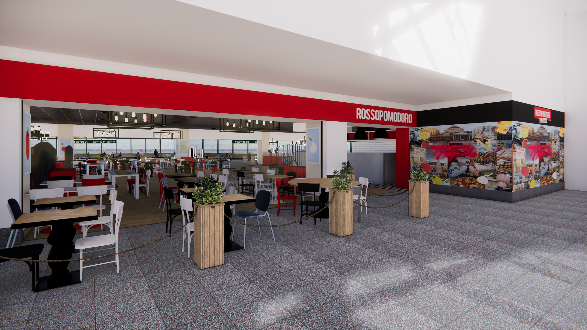 transform the provided restaurant interior image into a high end photorealistic render with neutral brightly lit space with warm highlights while keeping everything exactly the same same proportions same bar shape same seating same ceiling structure same wall finishes same spatial configuration do not change the furniture do not change the materials do not change the composition place diners eating pizza in the existing chairs and the existing tables do not move or alter any objects geometry textures colors or furniture positions the chairs throughout the restaurant must remain exactly in the same locations and proportions but their materials should read realistically the planterss outside the restaurant are vertical wooden strips as shown the chairs geometry should not change the chairss are a mix of red white black and blue maintain the colors as they are the red chairs white chairs and black chairs are painted wood and should show a slight amount of wood grain the blue chairs are matte metal add premium table settings including wine glasses cutlery cloth napkins while keeping all tables and chairs in their exact positions include modern young guests seated at the tables enjoying pizza casually social correctly scaled tastefully integrated without crowding or obstructing architectural details add a waiter taking order from some of the diners hints of warm glow from the chandiliers soft shadows enhanced color richness and luxurious catalog level realism improve depth and realism through material textures while keeping the entire scene exactly as originally designed do not add any furniture or change the compoition or geometry add only the diners place settings the waiter and enhance the photo realism including the cast of the window from behind the view which can be seen on the shiny tile floor and the wall above the entrance