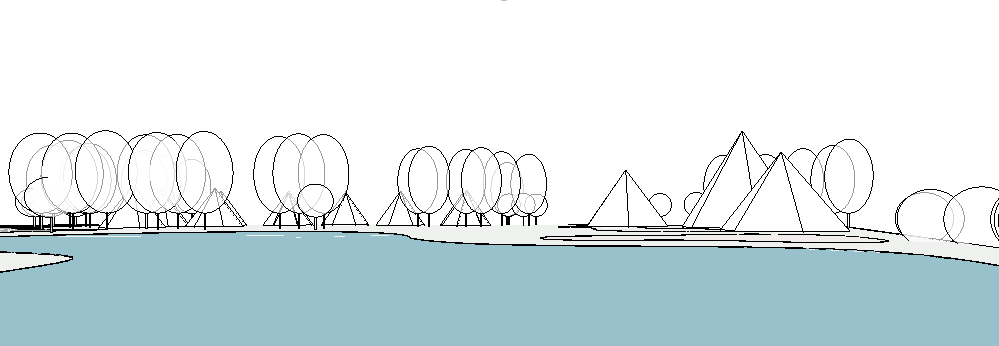 create a picturesque architectural render of a lakeside leisure site in the foreground on the left is a watersports pavilion there are people on the lake paddle boarding there is decking and a jetty at the side of the lake with people preparing to get in the water in the background is a curved leisure building clad in timber with light wood tones next to to the leisure building is a children s splash park with water features and to the right of the image is a large beige teepee balance the image with soft landscaping with colourful planting and natural lighting low level shrubs line the background with some trees and behind the trees in the far distance on the right are some holiday lodges