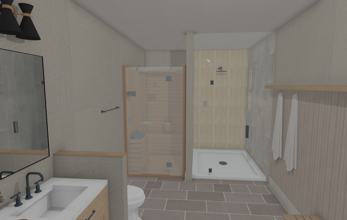do not add lines that are not already there transform this architectural interior design drawing into a photorealistic rendering maintain the exact layout dimensions and placement of all elements do not change materials colors or geometry additionally apply a very subtle hand drawn architectural sketch overlay faint pencil line edges around furniture silhouettes cabinetry and key architectural elements as if barely sketched over the photograph keep it extremely subtle the photorealistic image must remain fully dominant