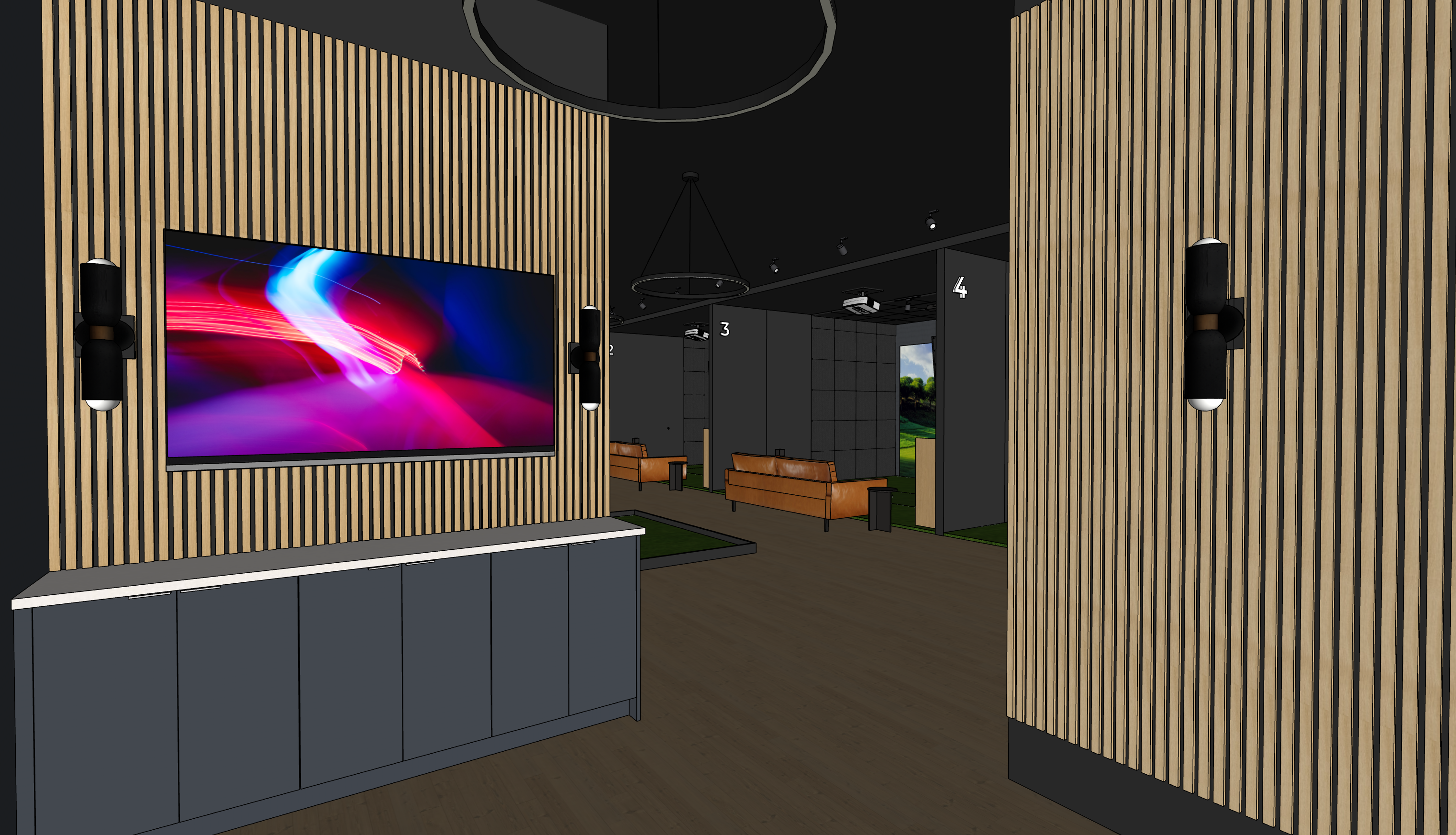 this image is an interior of an indoor golf lounge the numbers on the wall are back lit cabinets are dark navy blue with stainless steel cabinet edgepulls the round chandelier are modern led light chandelier