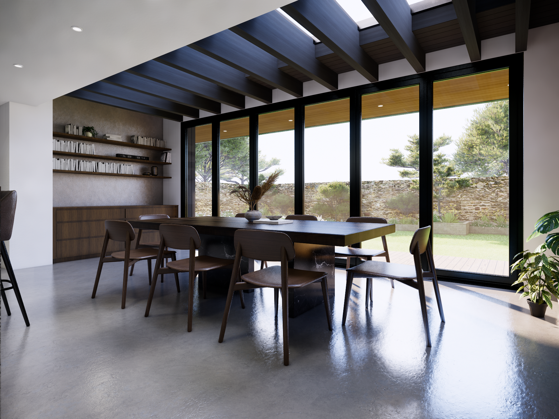 convert this daytime interior render into a realistic nighttime scene while keeping the space well lit use a balanced mix of neutral artificial lighting from downlights to evenly illuminate the interior without making it too dark or overly warm show a dark night sky through the windows with subtle exterior landscaping lights visible outside maintain clear visibility of materials true to life colors soft shadows and a clean inviting atmosphere