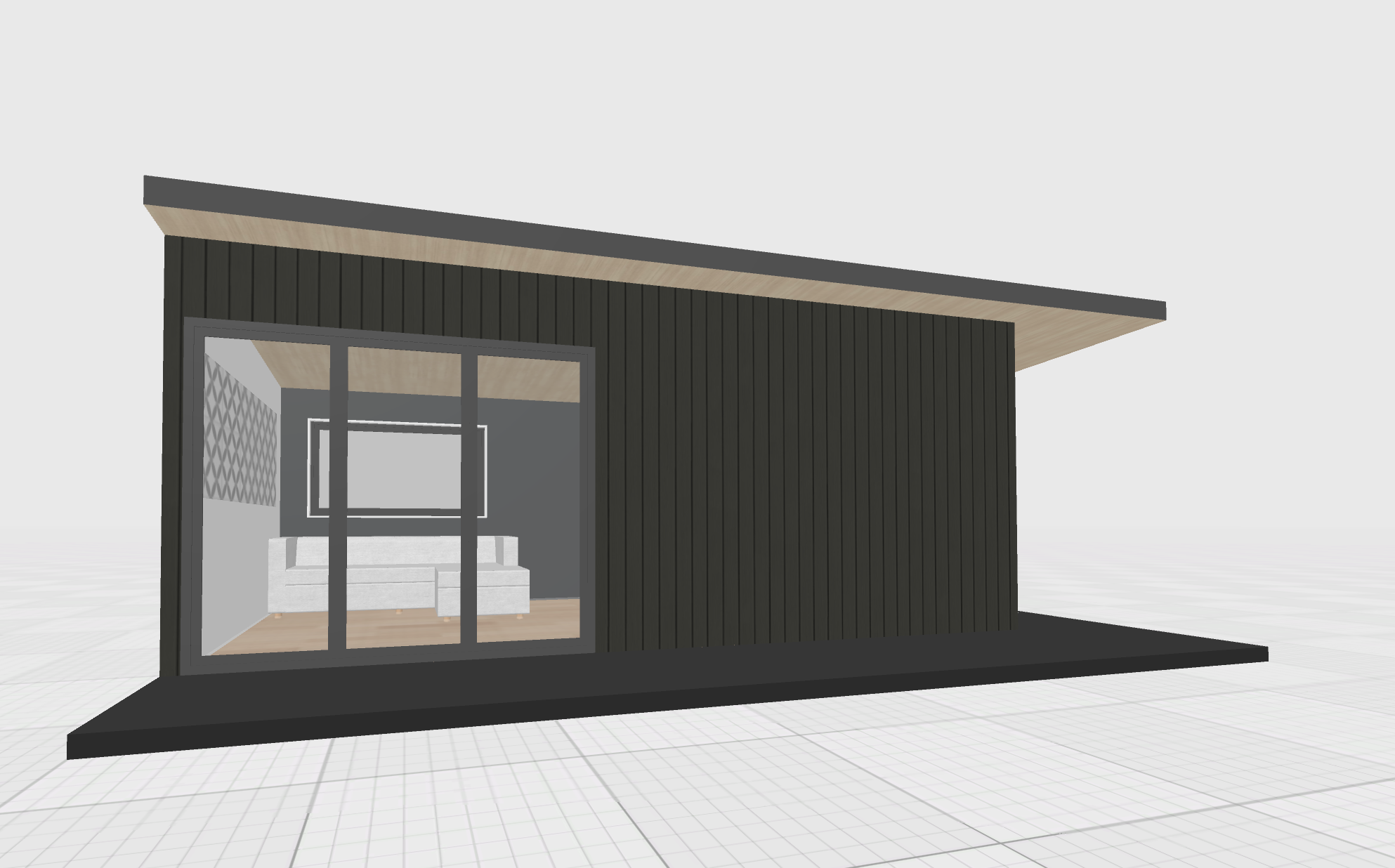 render into tropical setting with grass and coconut trees dark board and batten cladding plywood soffits