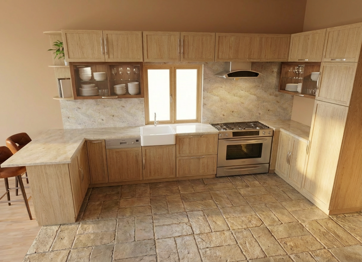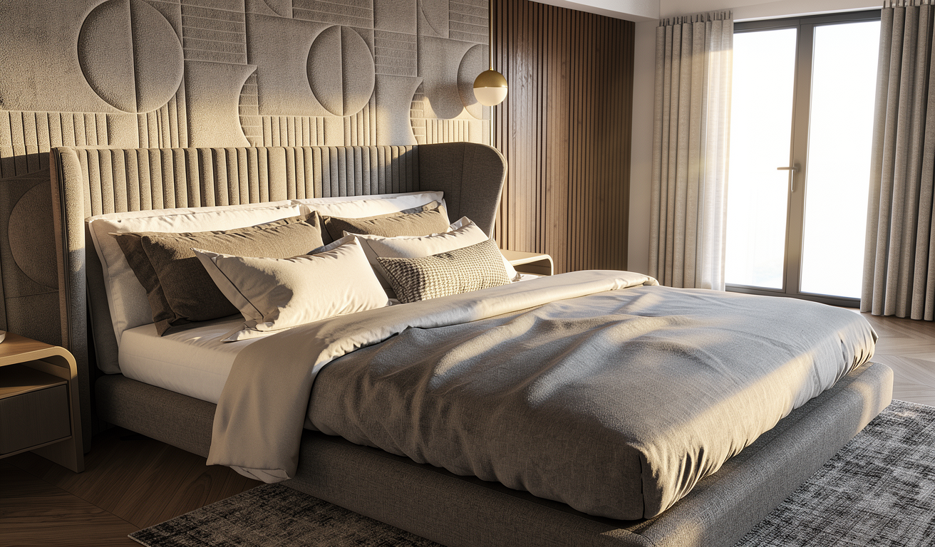 the design must strictly follow and be based on the provided model preserving the exact architectural layout proportions dimensions camera angle and spatial composition from the original project ultra detailed photorealistic 8k resolution cinematic composition volumetric lighting high dynamic range architectural visualization quality this is a bedroom on a building on a high level no city view show the sky but there is a balcony make the wood lighter