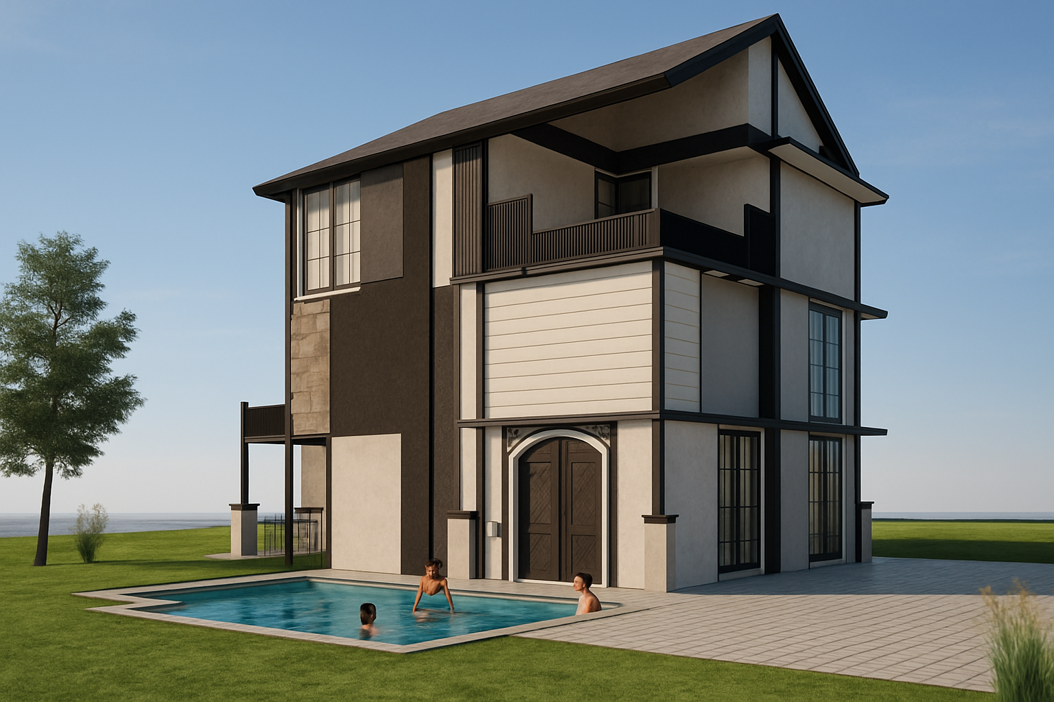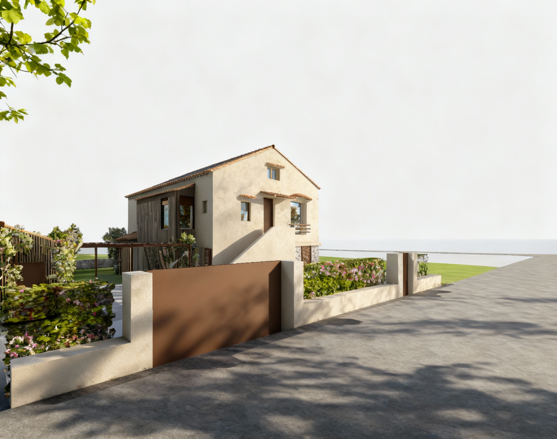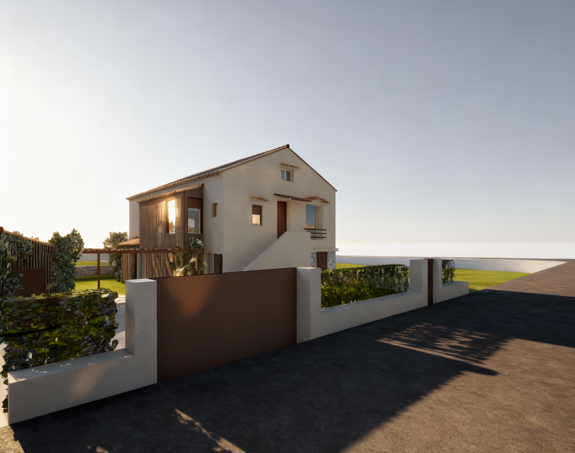 reflects on the windows and sunlight sun at the left more light and jasmine vegetation enhance vegetation