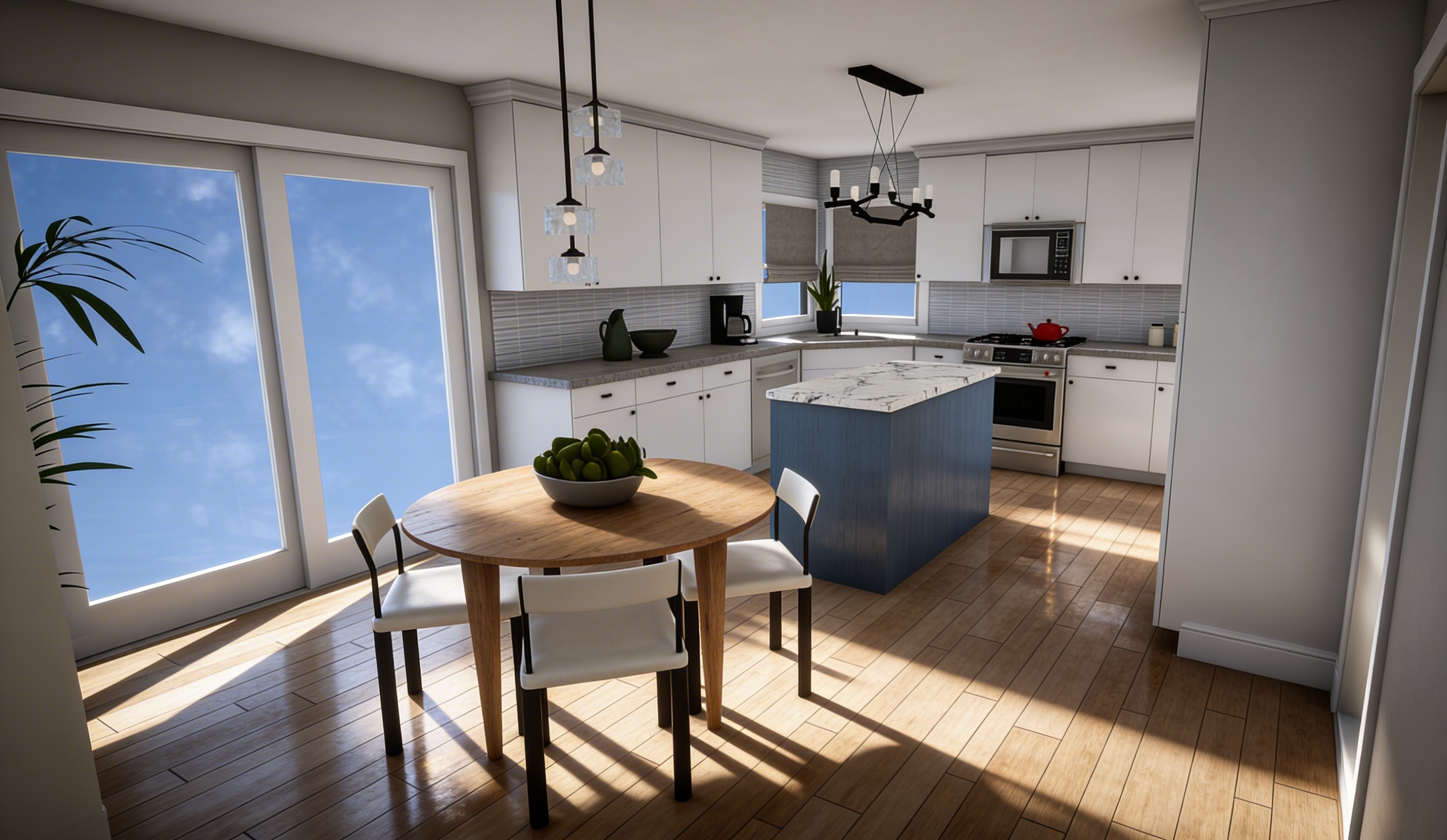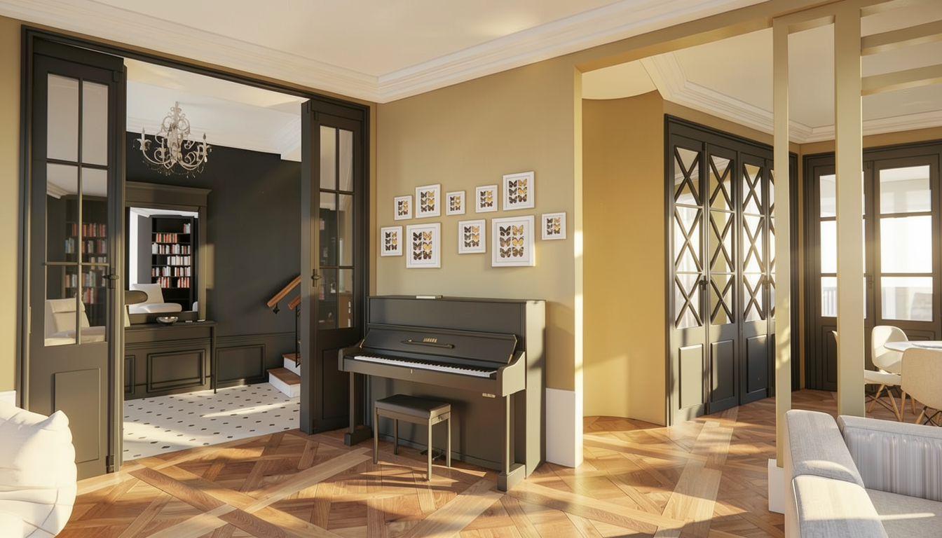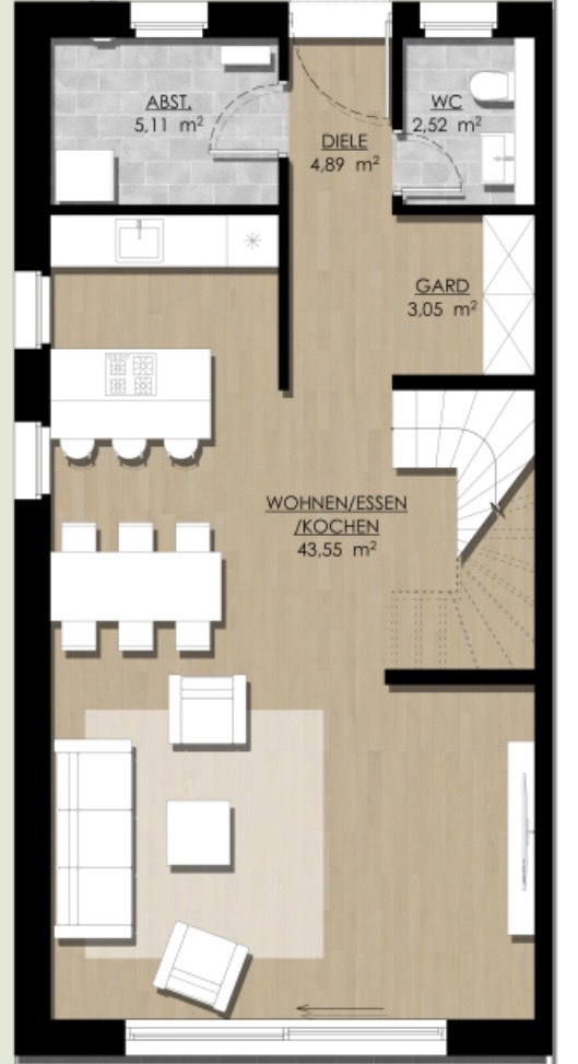 create a photorealistic 3d floor plan in a strict orthographic top down view 90 vertical camera angle camera must be perfectly perpendicular to the floor no perspective distortion no angled or isometric view no dollhouse effect no visible wall height above window line keep the exact original 2d layout proportions wall thickness door swings window placements staircase geometry and room dimensions exactly as provided style modern residential interior in germany rendering style realistic materials but clean architectural visualization lighting soft daylight simulation evenly distributed no dramatic shadows image ratio vertical 4 5 or 1 1 centered layout material interior setup light oak parquet flooring in living areas grey tiles in wc and storage white matte walls white interior doors built in wardrobes in gard curved staircase exactly as drawn in plan kitchen island with 3 stools 6 person dining table sofa armchair coffee table tv on right wall important do not elevate camera do not crop walls diagonally do not create a 3d cutaway perspective maintain a clean architectural top view presentation similar to a high end marketing floor plan